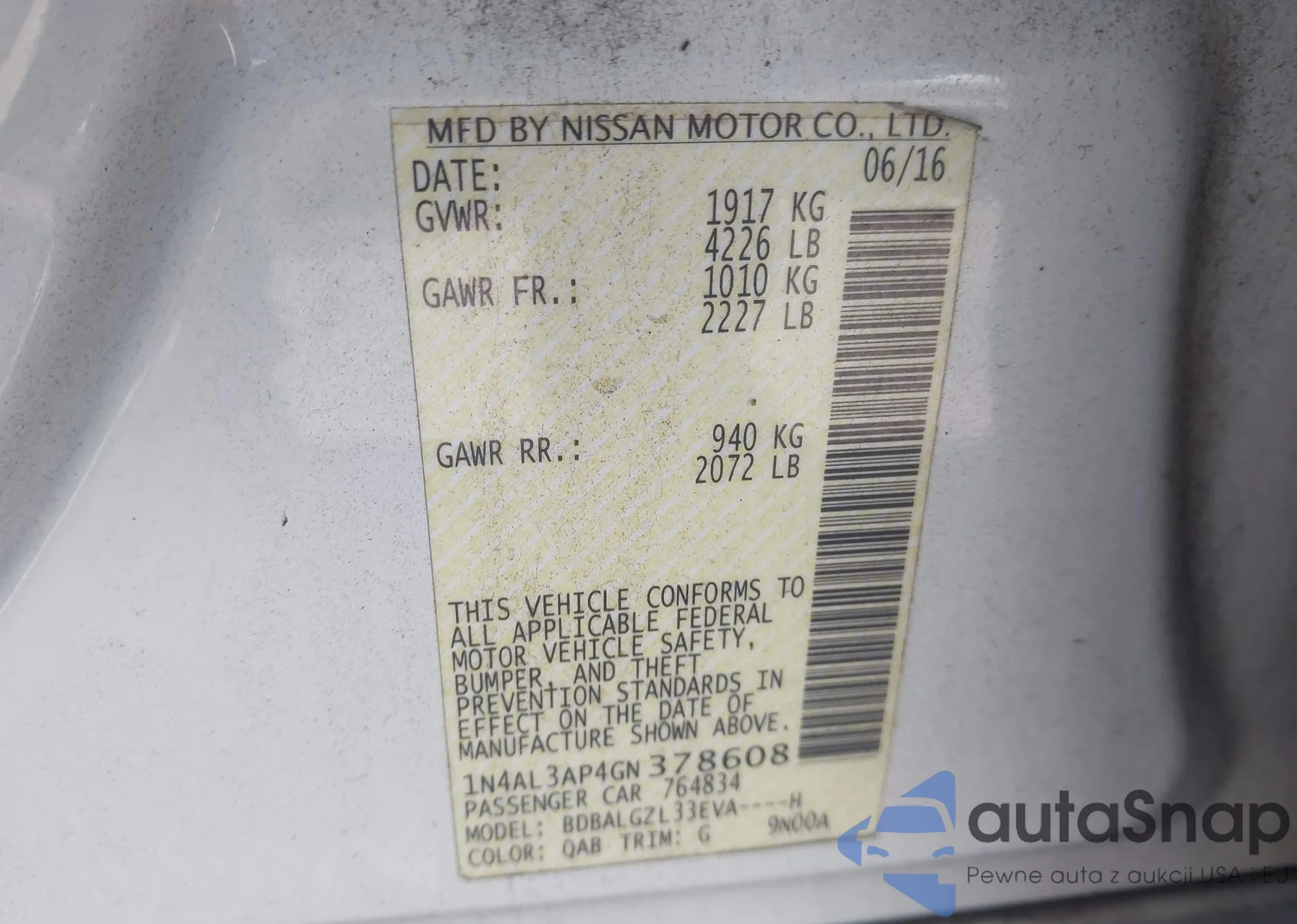 LOT: 43589418 VIN: 1N4AL3AP4GN378608