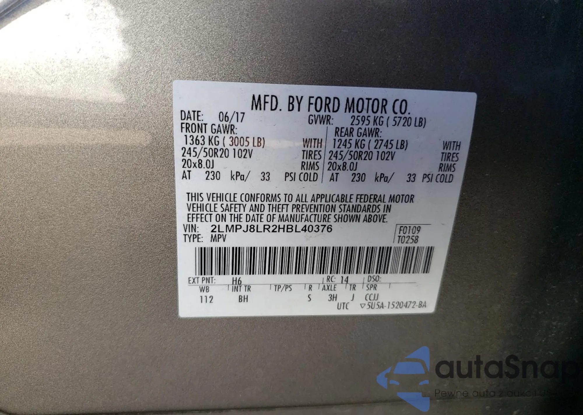 LOT: 91316265 VIN: 2LMPJ8LR2HBL40376