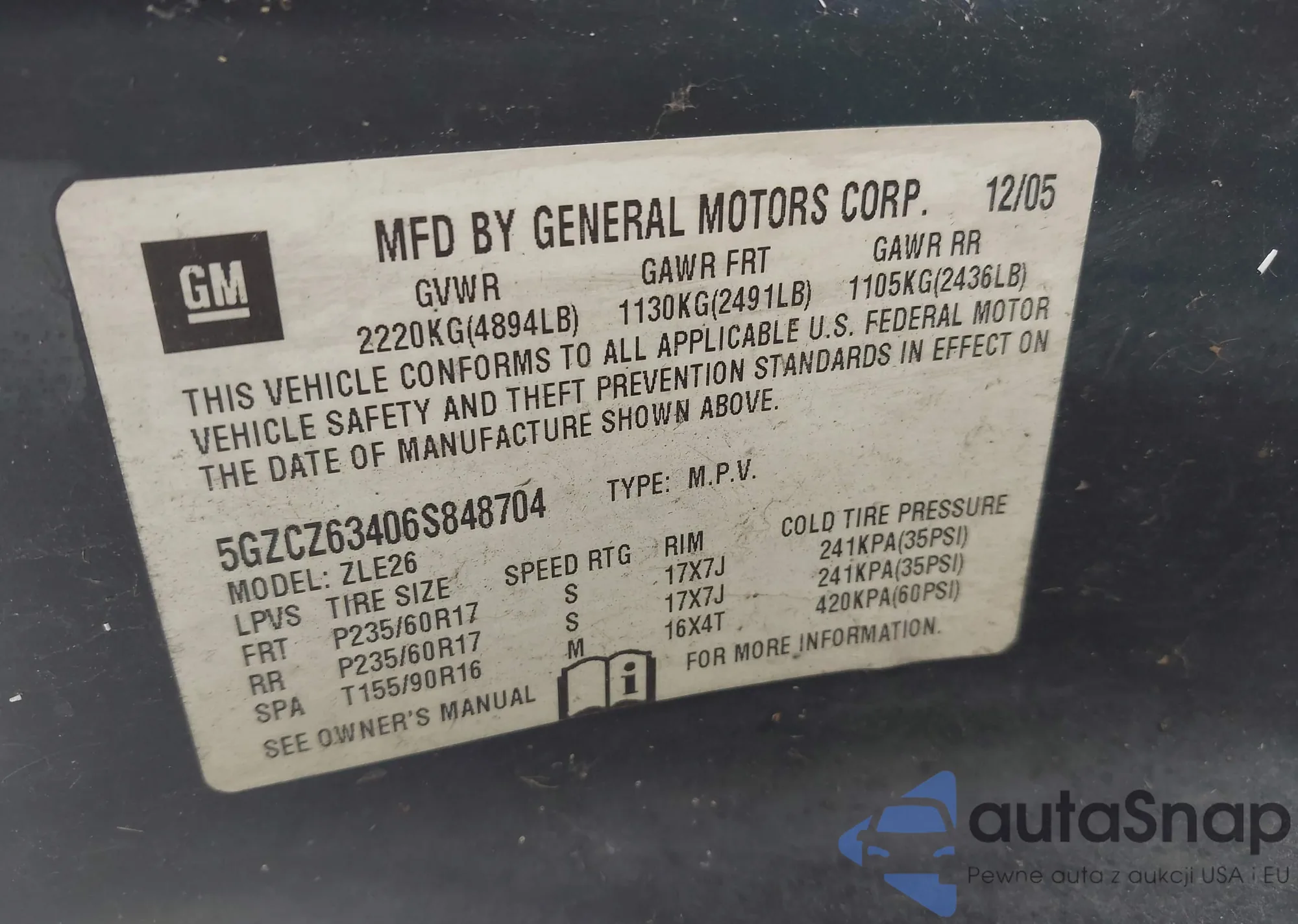 • VIN 5GZCZ63406S848704