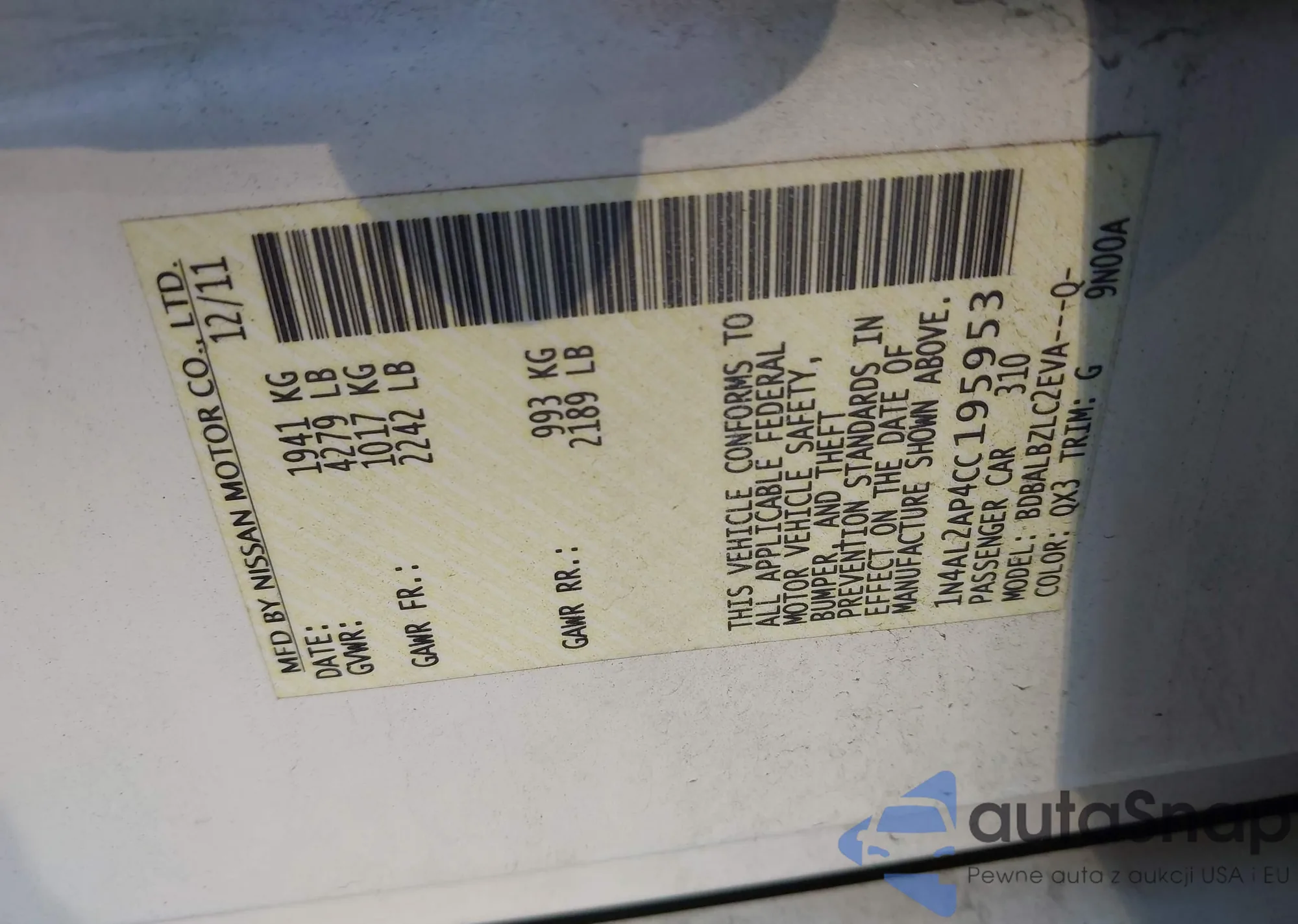 LOT: 43714186 VIN: 1N4AL2AP4CC195953