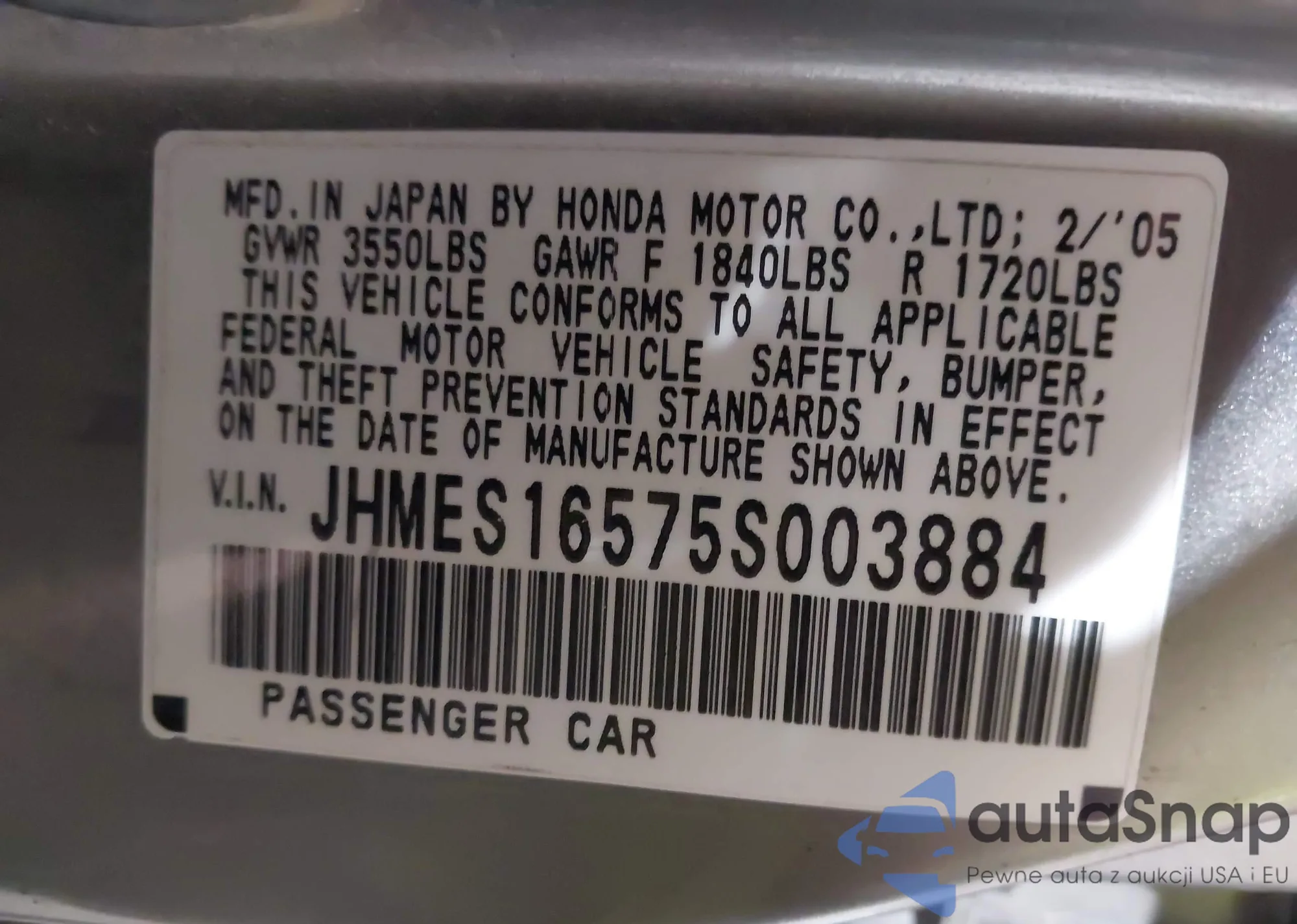 LOT: 43814445 VIN: JHMES16575S003884