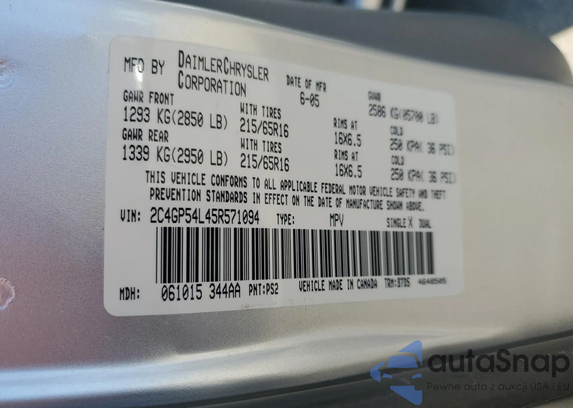 2005 Chrysler Town & Country Touring from USA, damaged, VIN 2C4GP54L45R571094