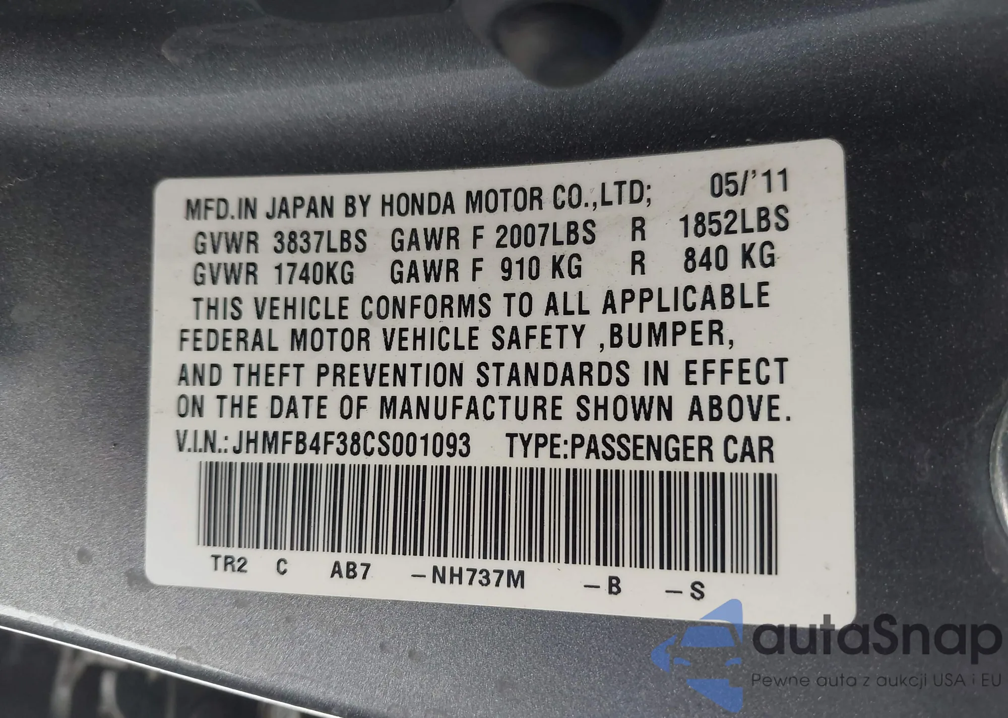 • VIN JHMFB4F38CS001093