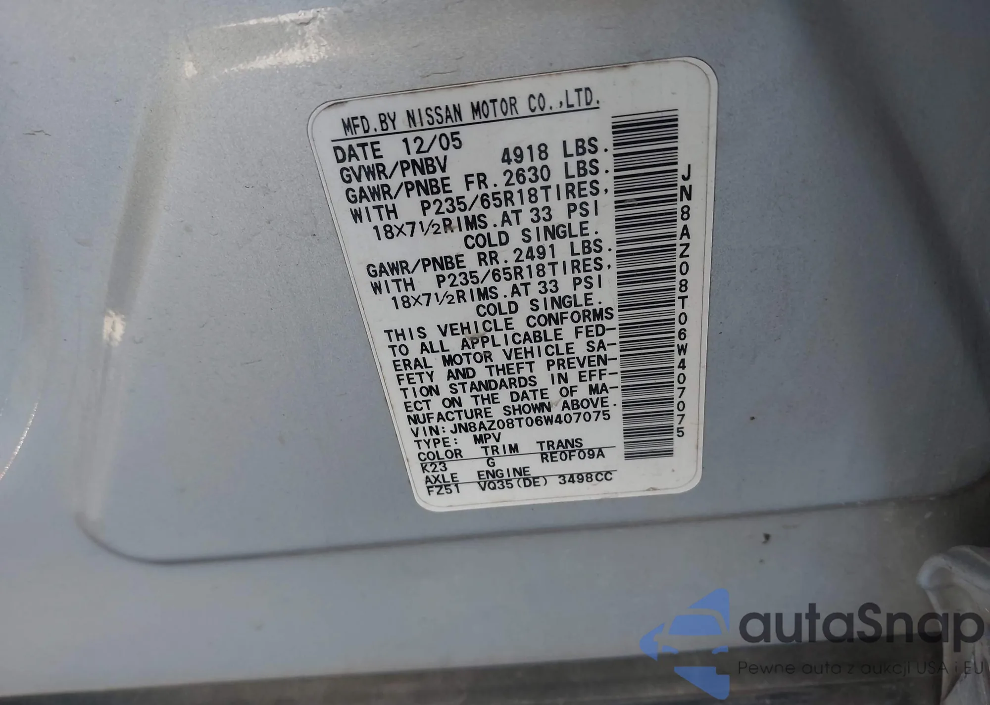 LOT: 43634167 VIN: JN8AZ08T06W407075
