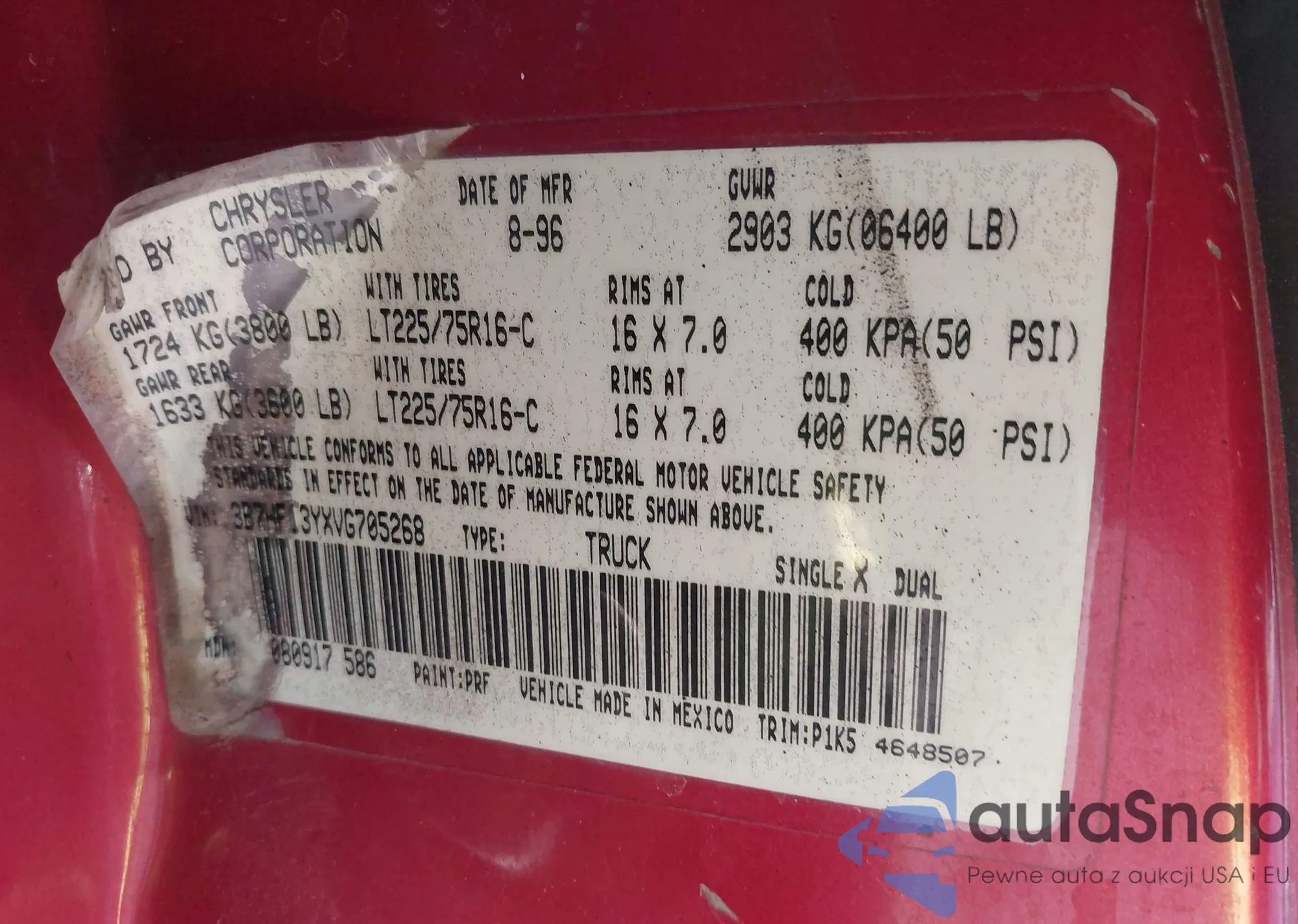 • VIN 3B7HF13YXVG705268