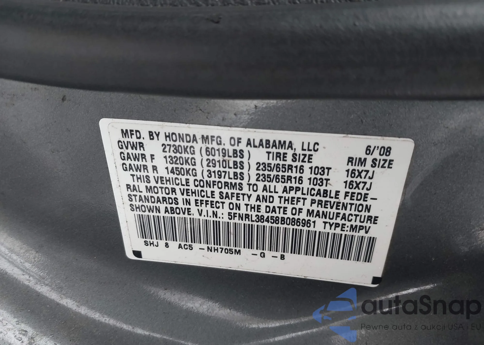 • VIN 5FNRL38458B086961