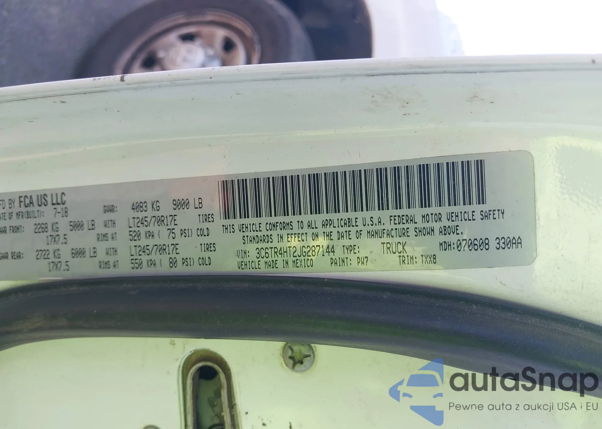 LOT: 43221211 VIN: 3C6TR4HT2JG287144