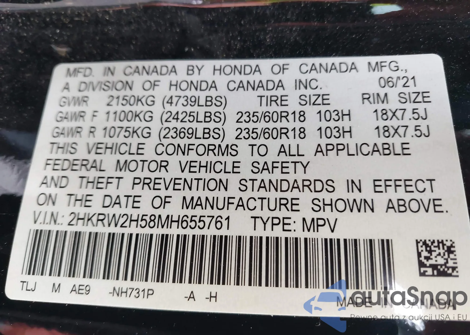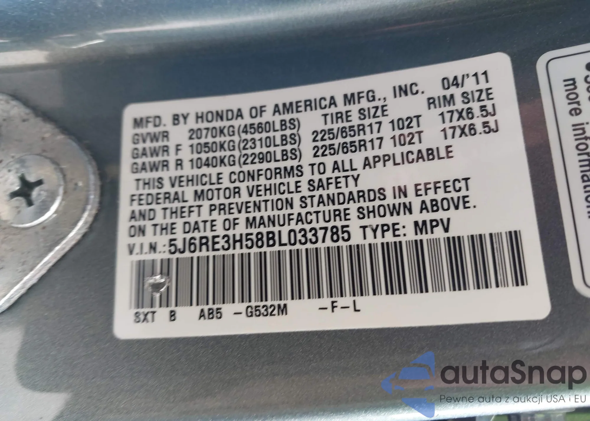 • VIN 5J6RE3H58BL033785
