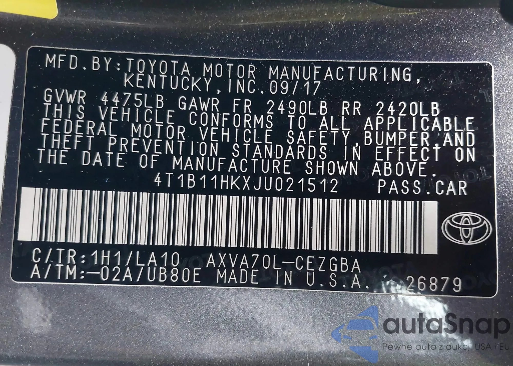 LOT: 43452151 VIN: 4T1B11HKXJU021512