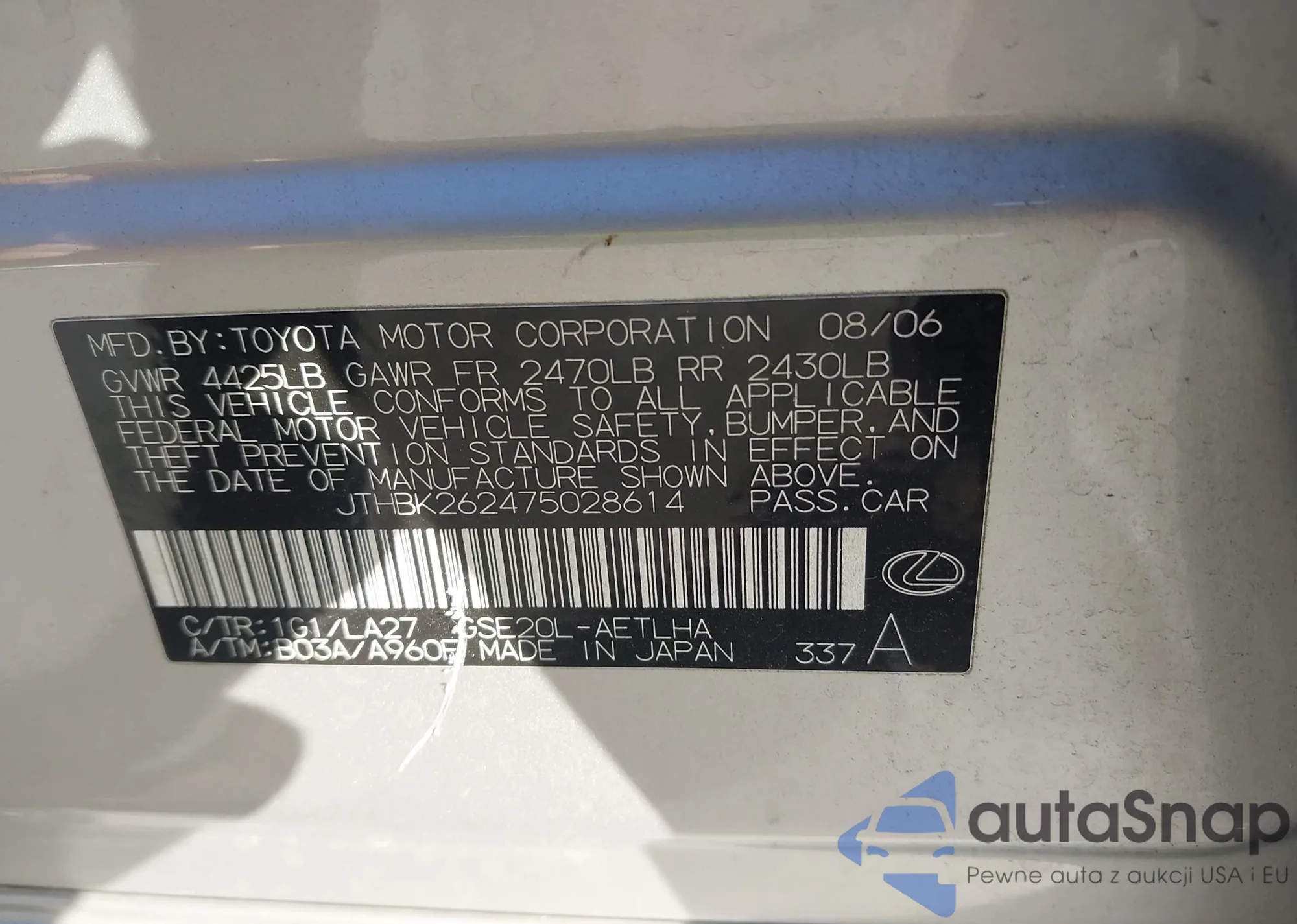 LOT: 43297367 VIN: JTHBK262475028614