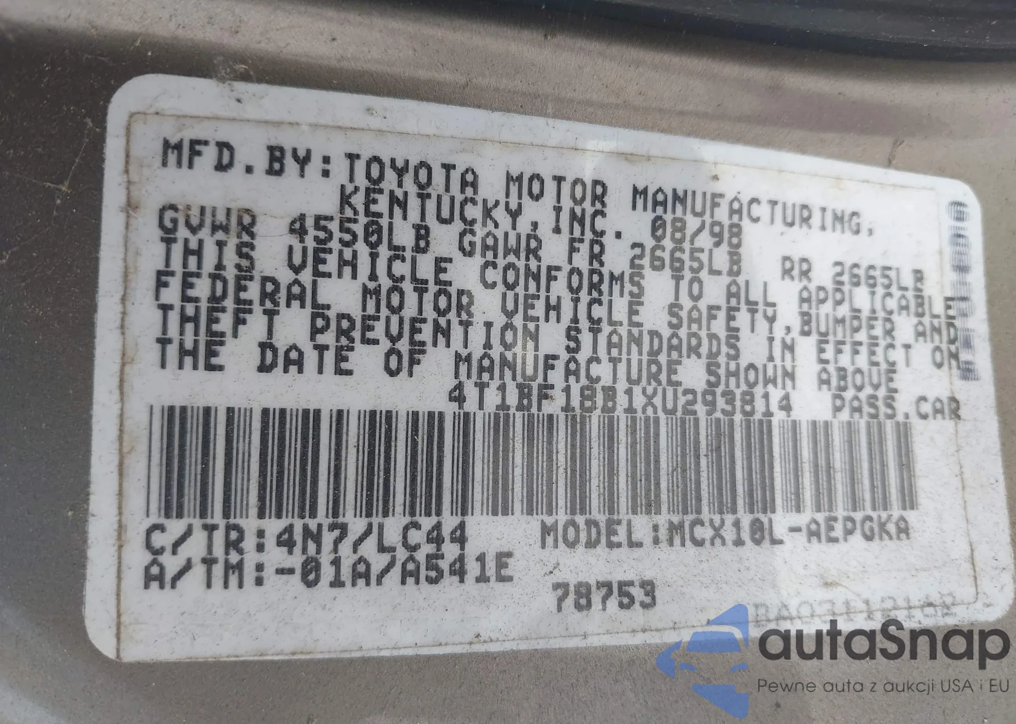 • VIN 4T1BF18B1XU293814