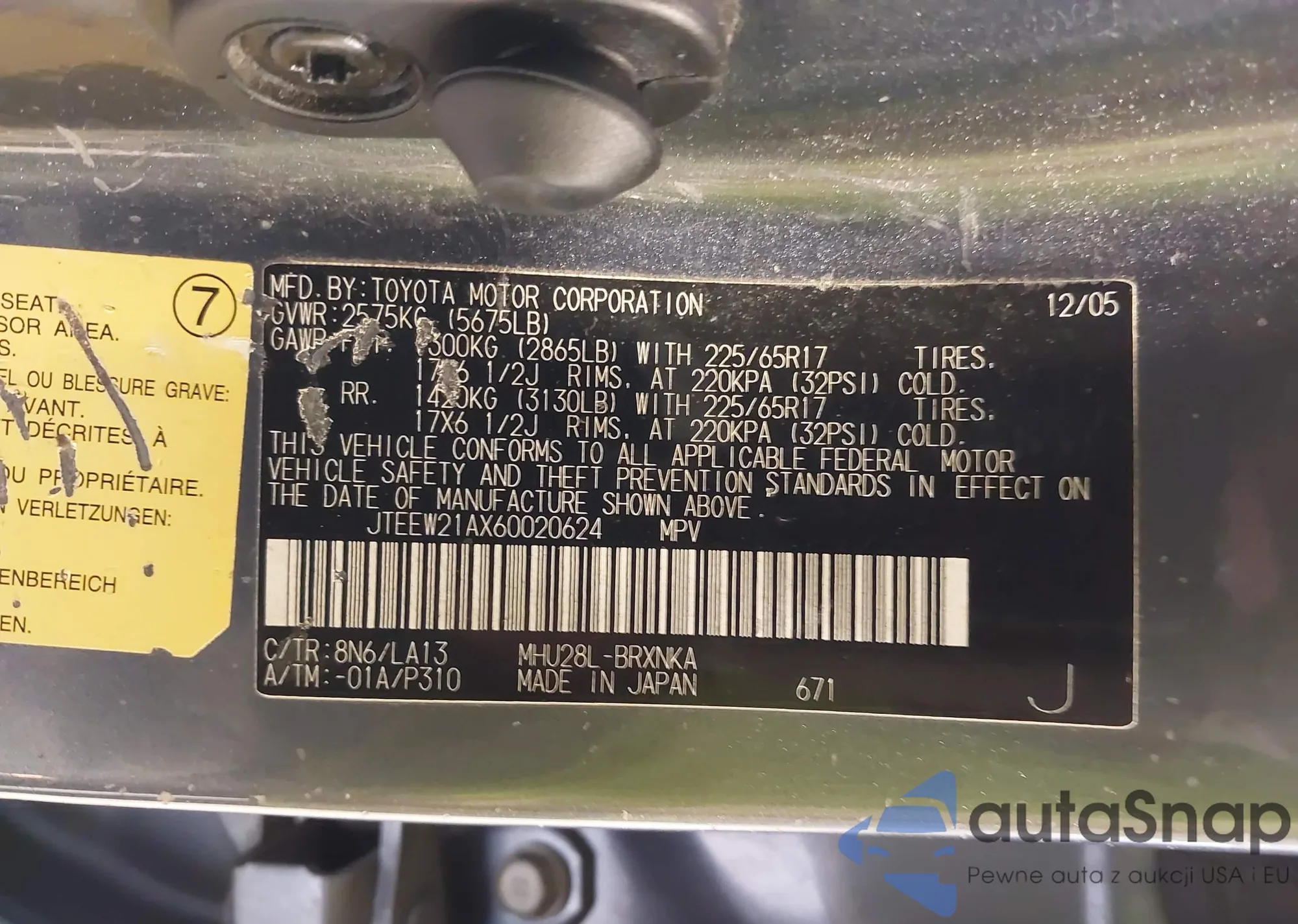 LOT: 94070255 VIN: 4T1DAACK8SU010901