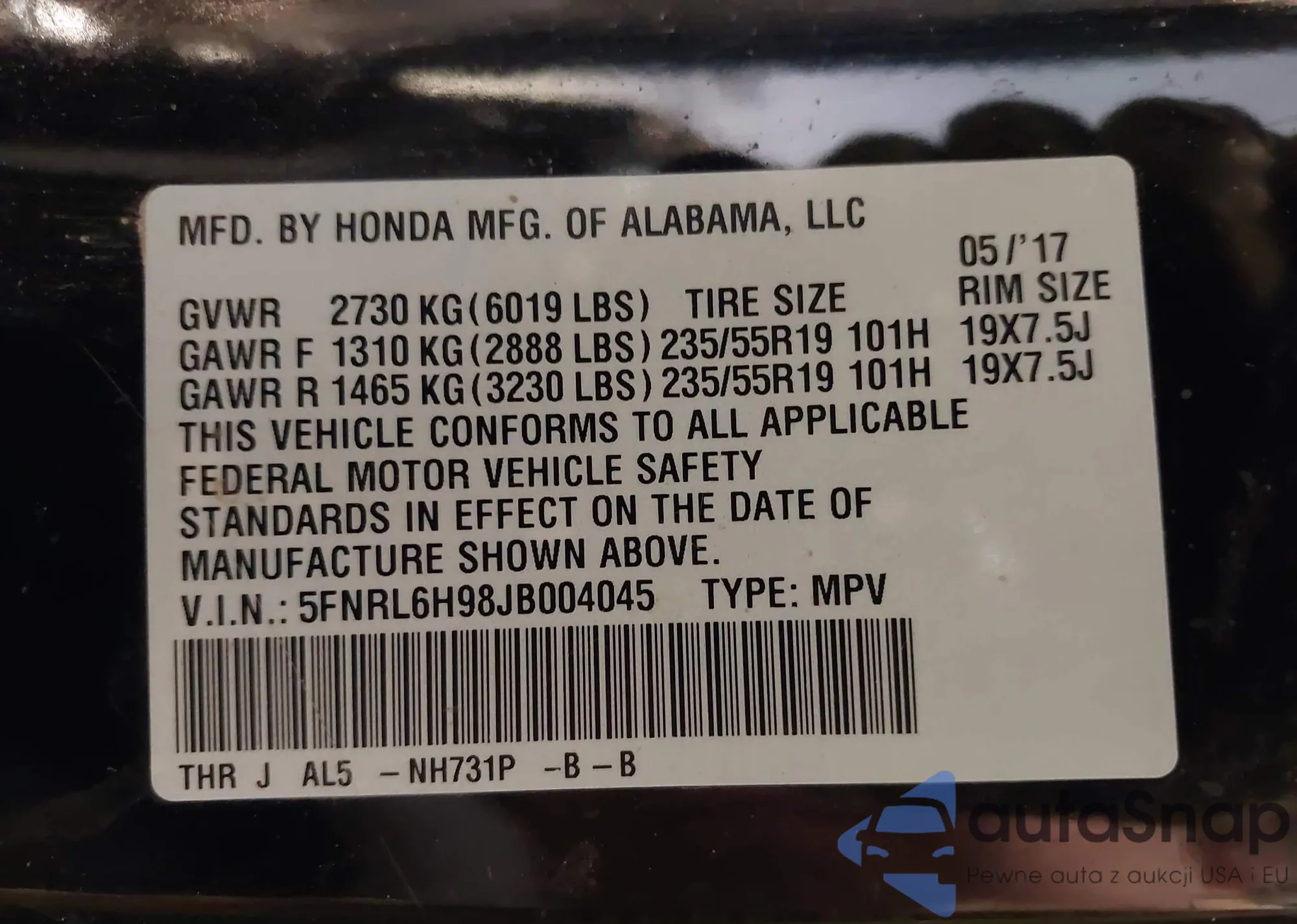 • VIN 5FNRL6H98JB004045
