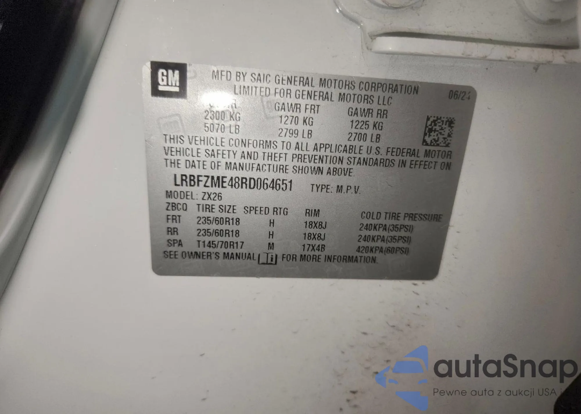 LOT: 94296075 VIN: 5NPEL4JA3MH070676