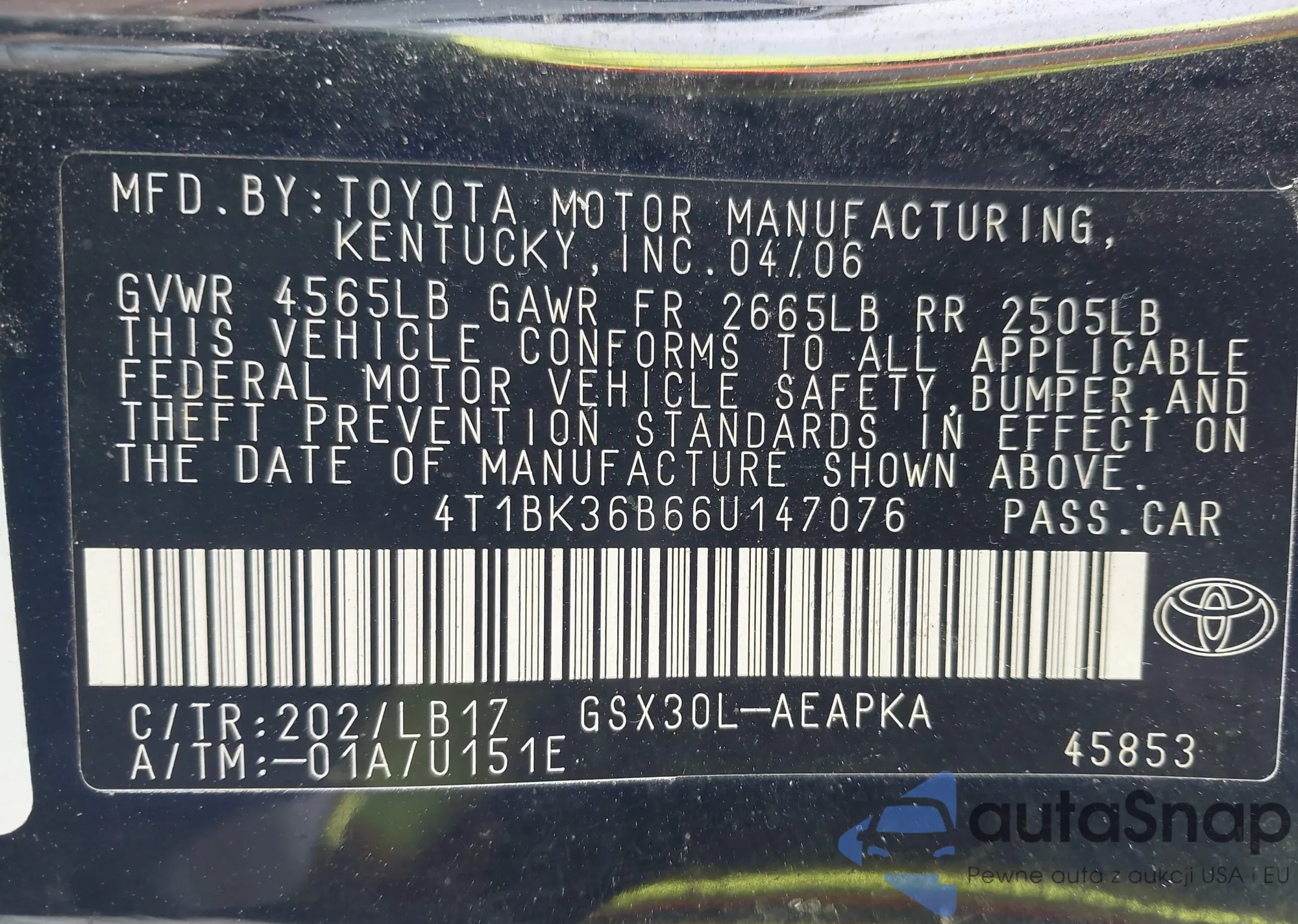LOT: 43722578 VIN: 4T1BK36B66U147076