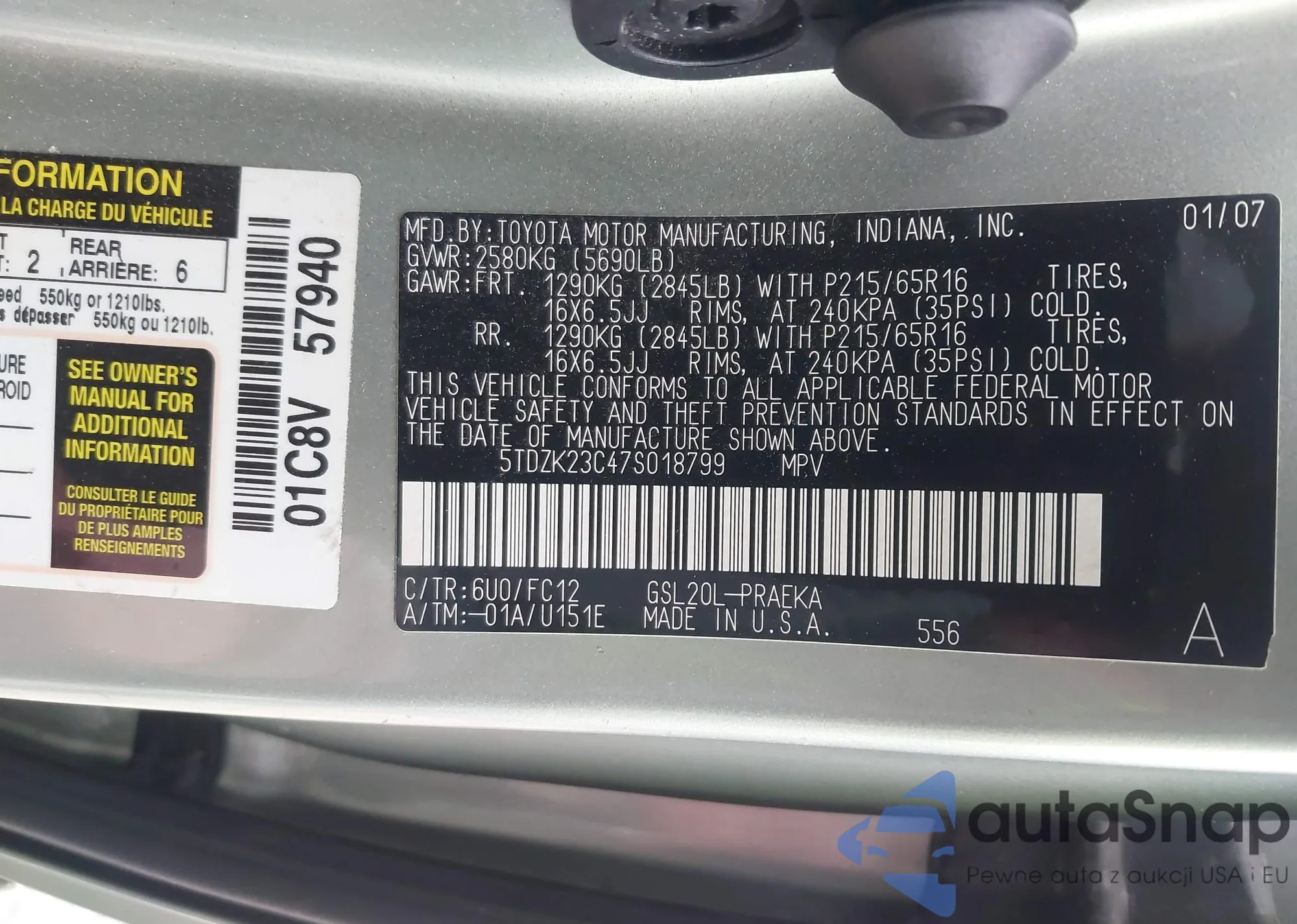 LOT: 43663962 VIN: 5TDZK23C47S018799