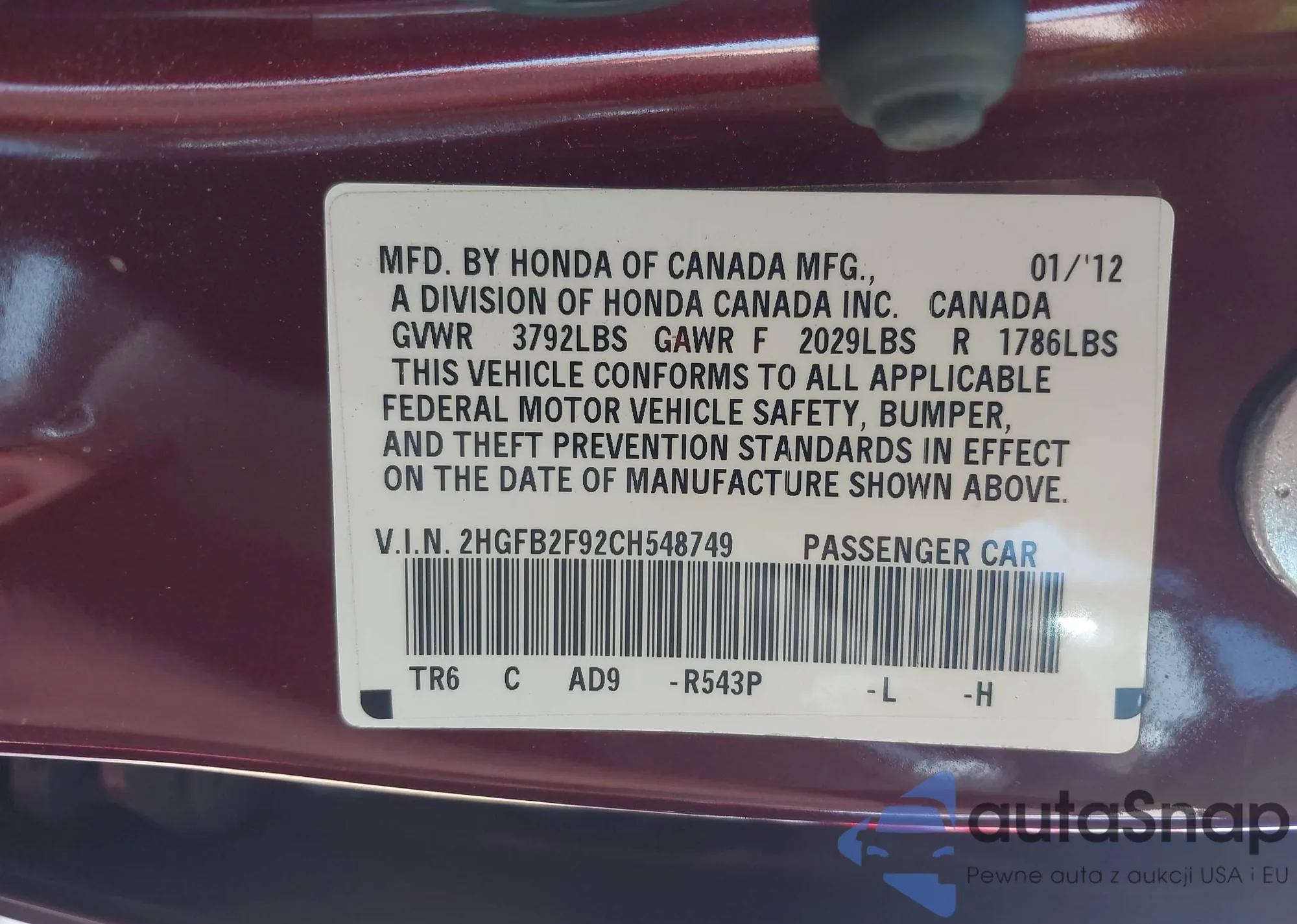 • VIN 2HGFB2F92CH548749
