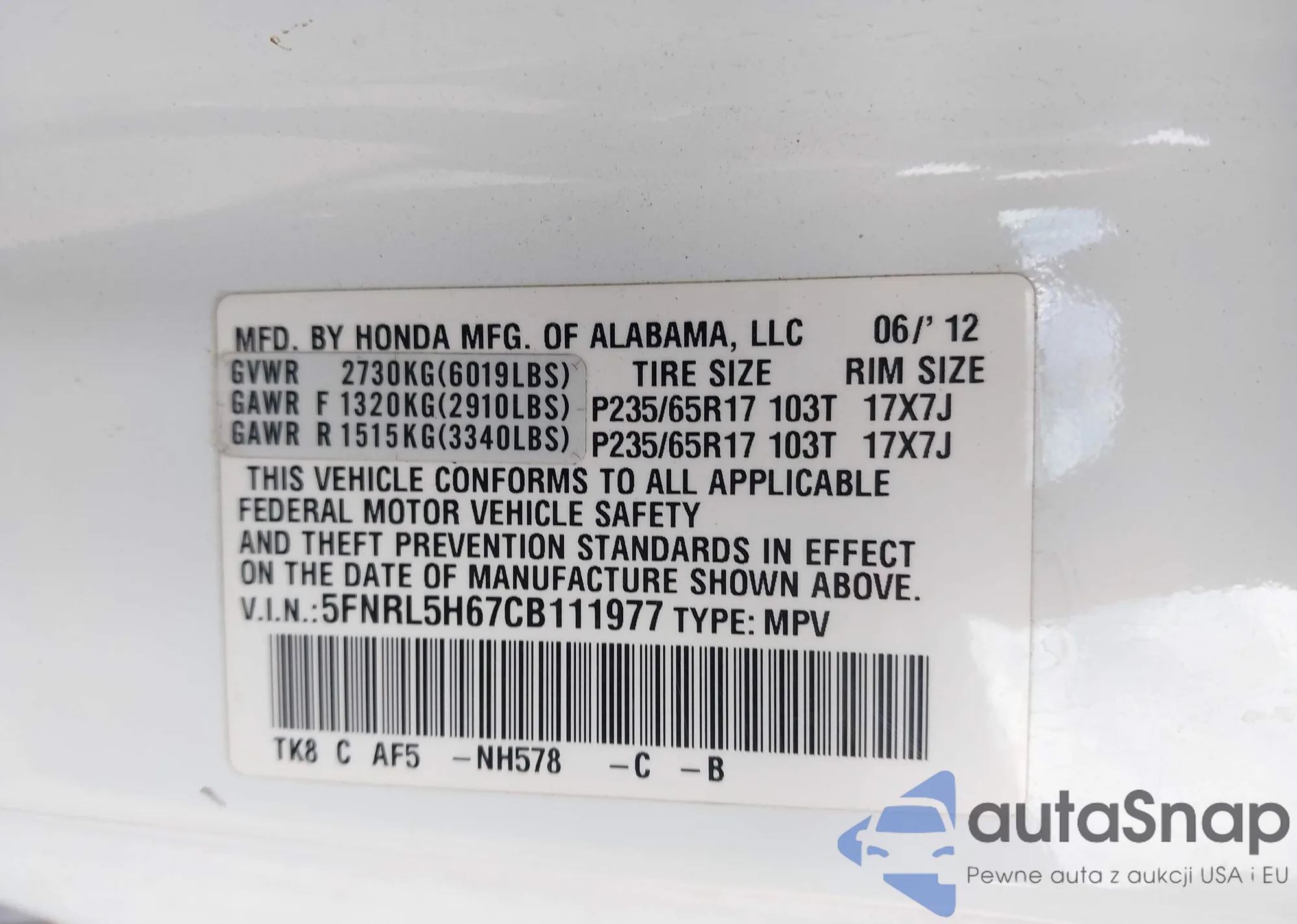 • VIN 5FNRL5H67CB111977