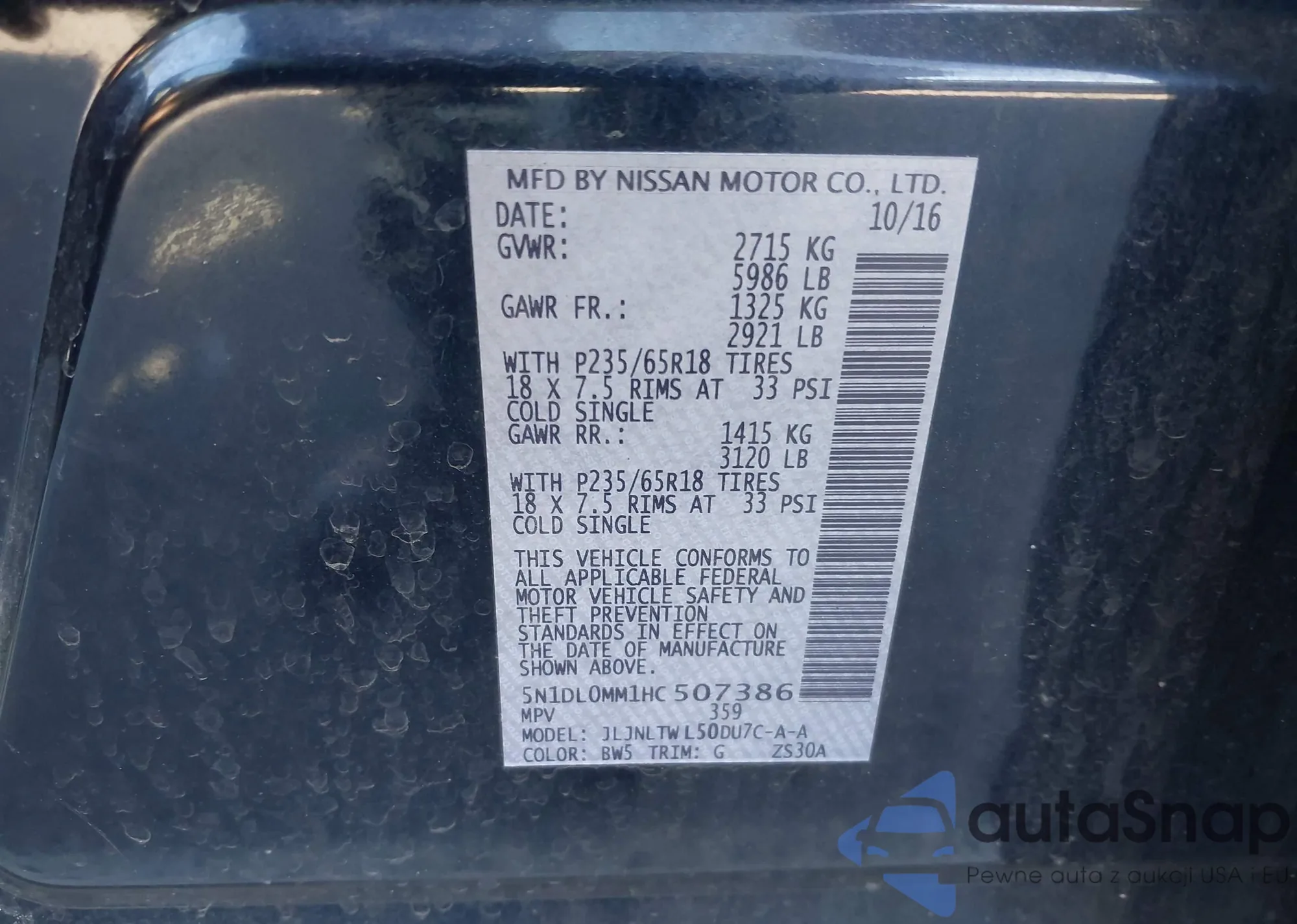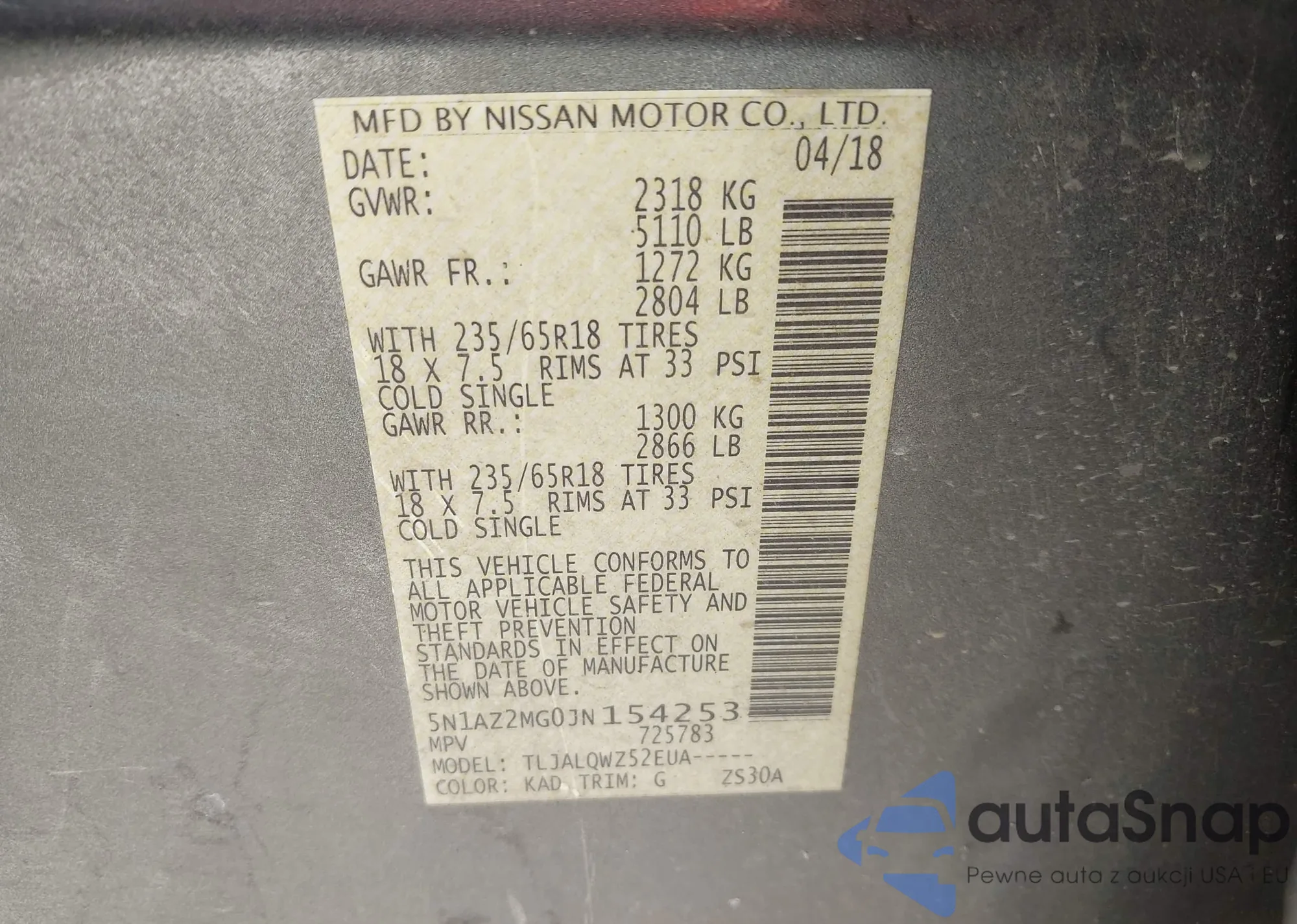 LOT: 43441767 VIN: 5N1AZ2MG0JN154253