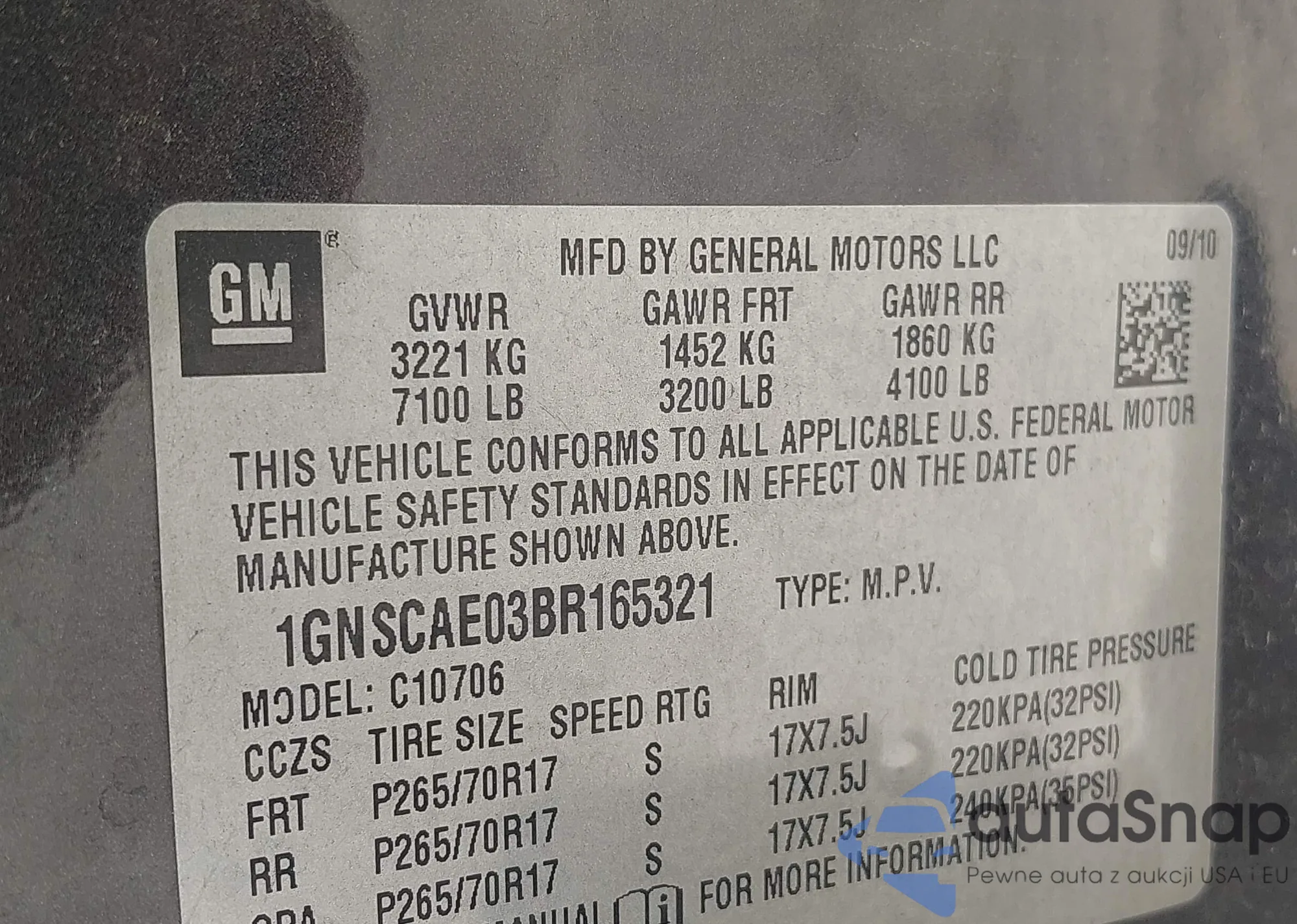 LOT: 43447126 VIN: 1GNSCAE03BR165321