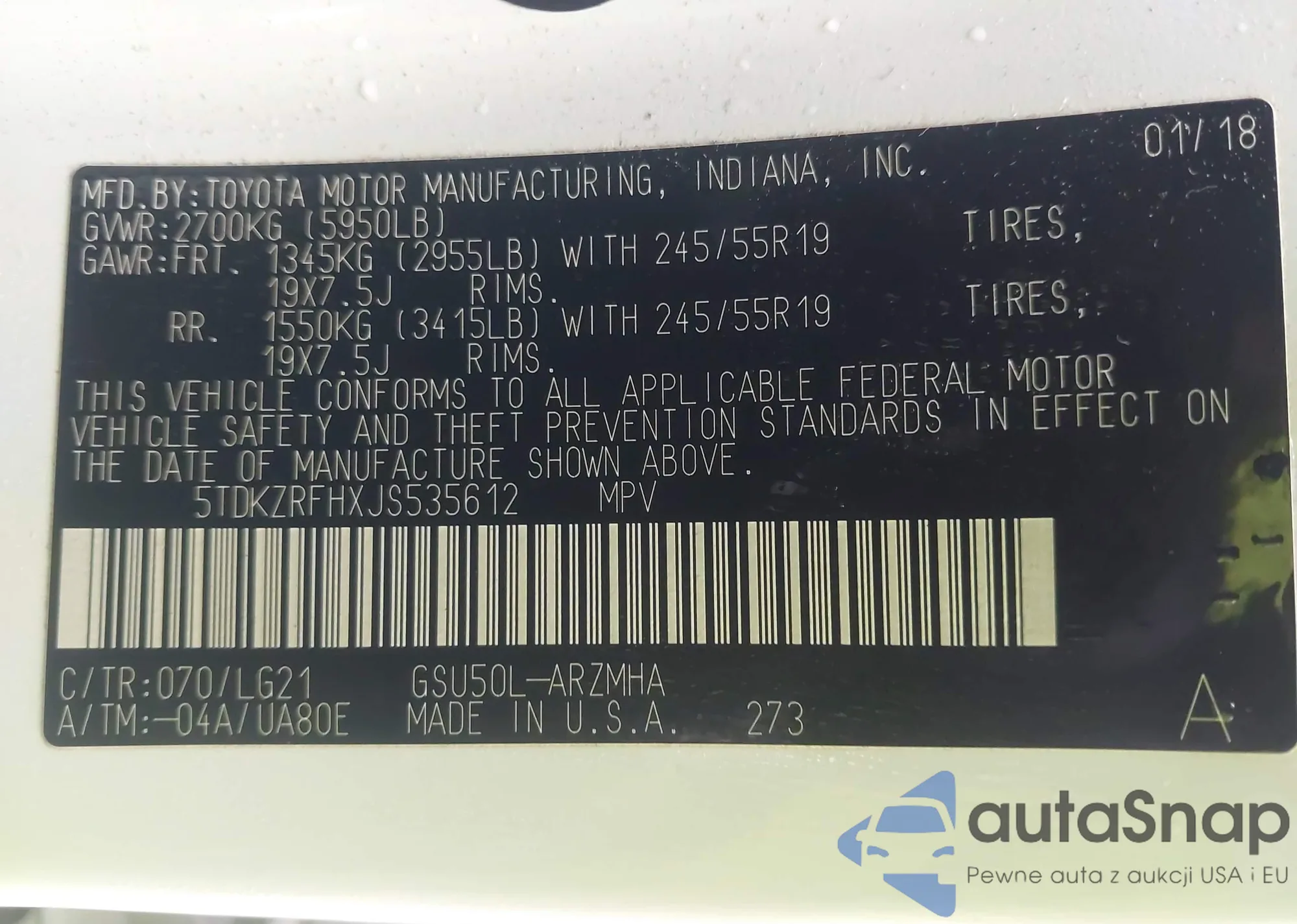 • VIN 5TDKZRFHXJS535612