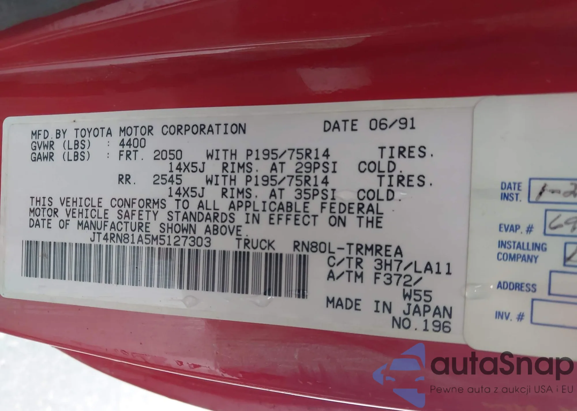 LOT: 43439404 VIN: JT4RN81A5M5127303