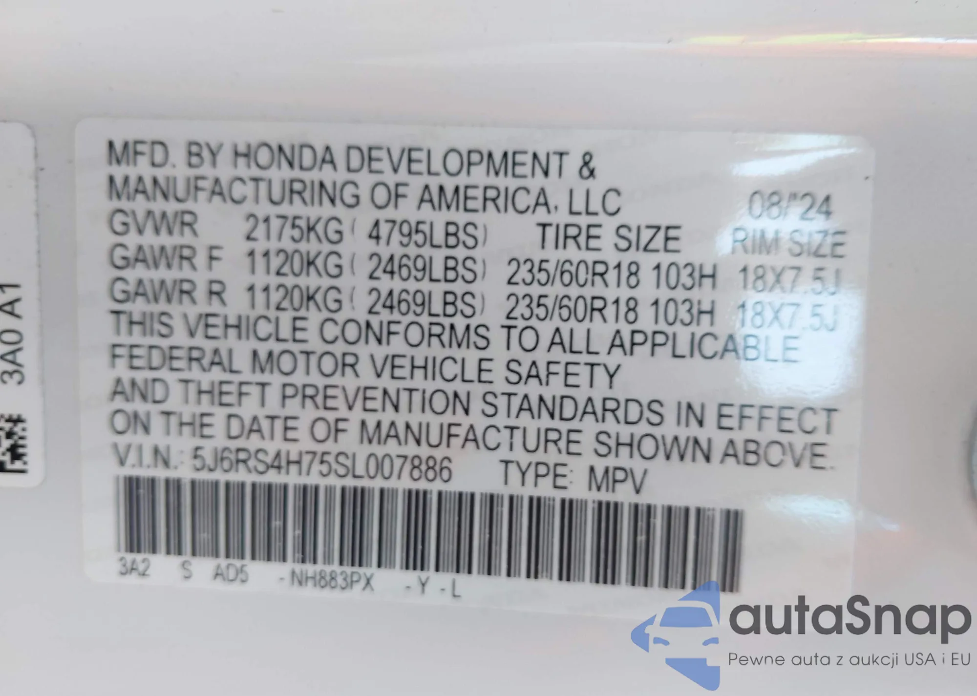 LOT: 43375962 VIN: 5J8YD4H0XLL020523