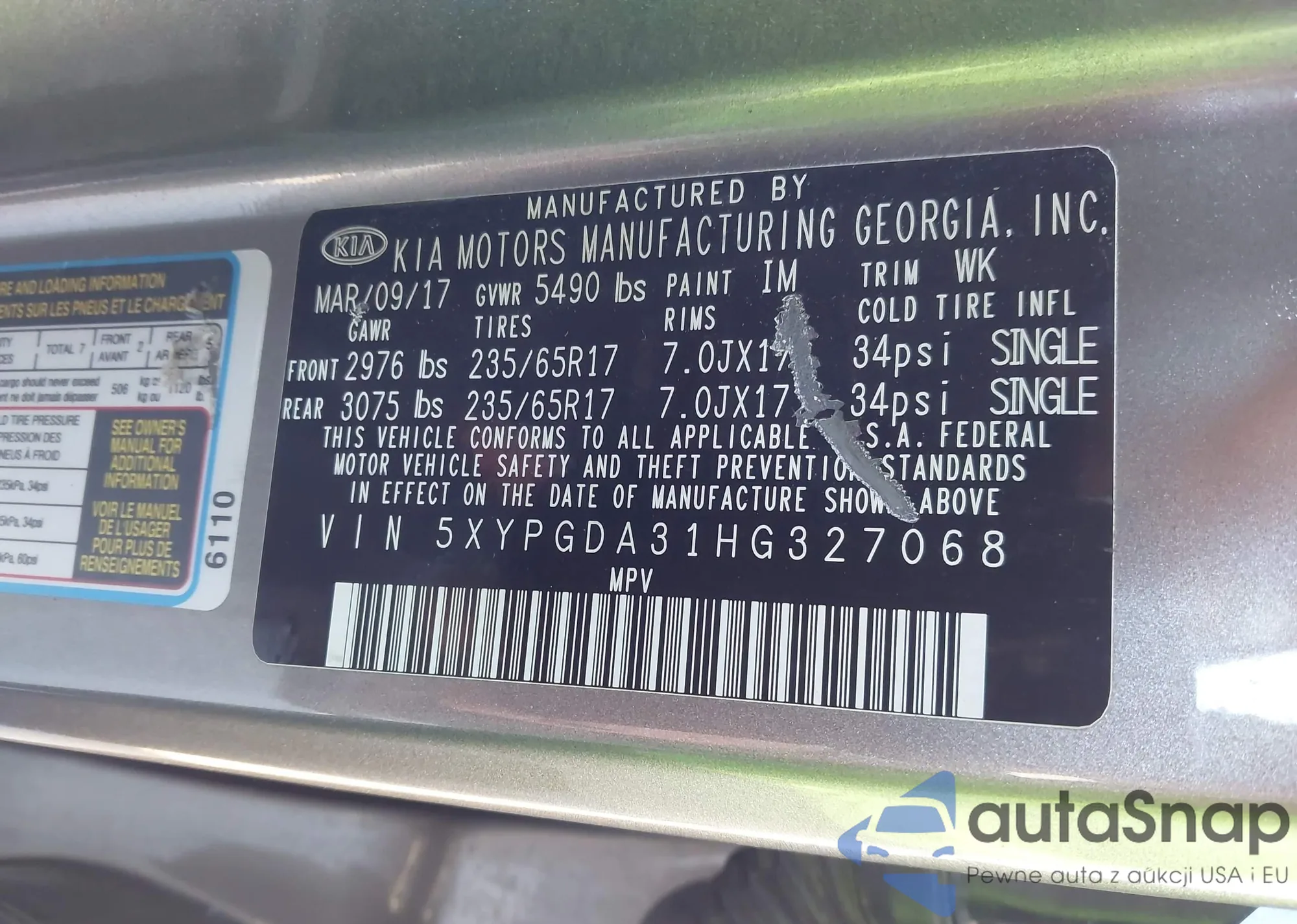• VIN 5XYPGDA31HG327068