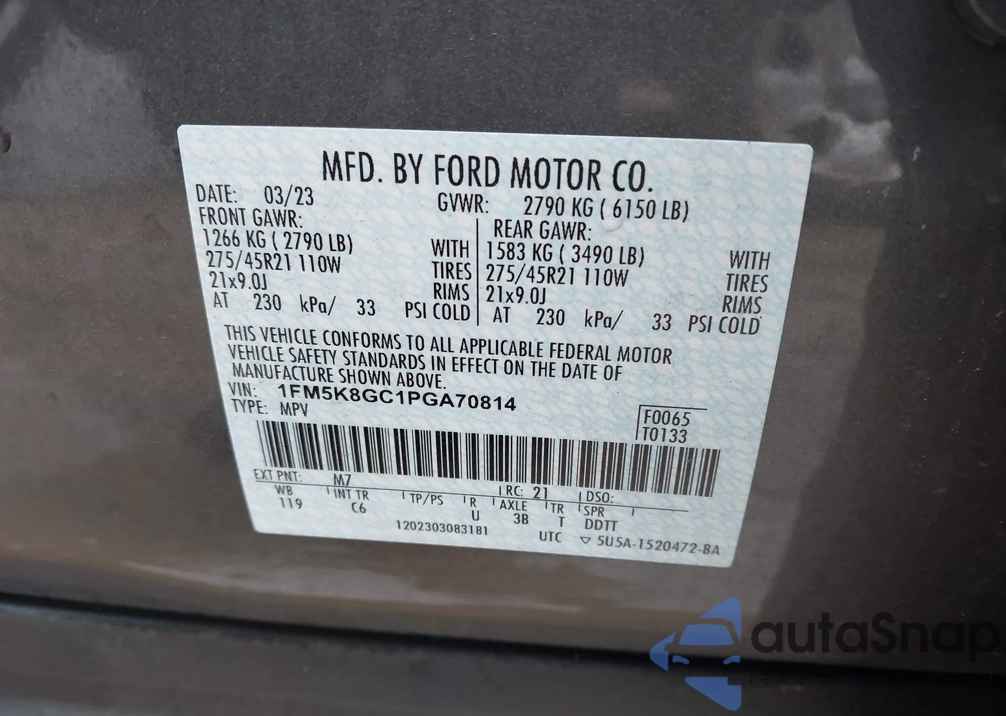 LOT: 43549438 VIN: 1FM5K8GC1PGA70814