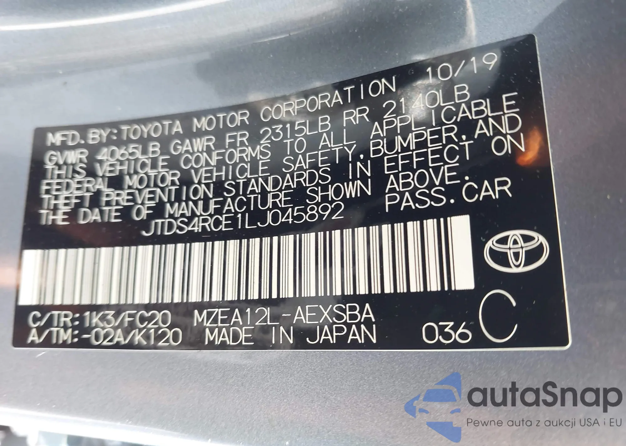 LOT: 43564653 VIN: JTDS4RCE1LJ045892