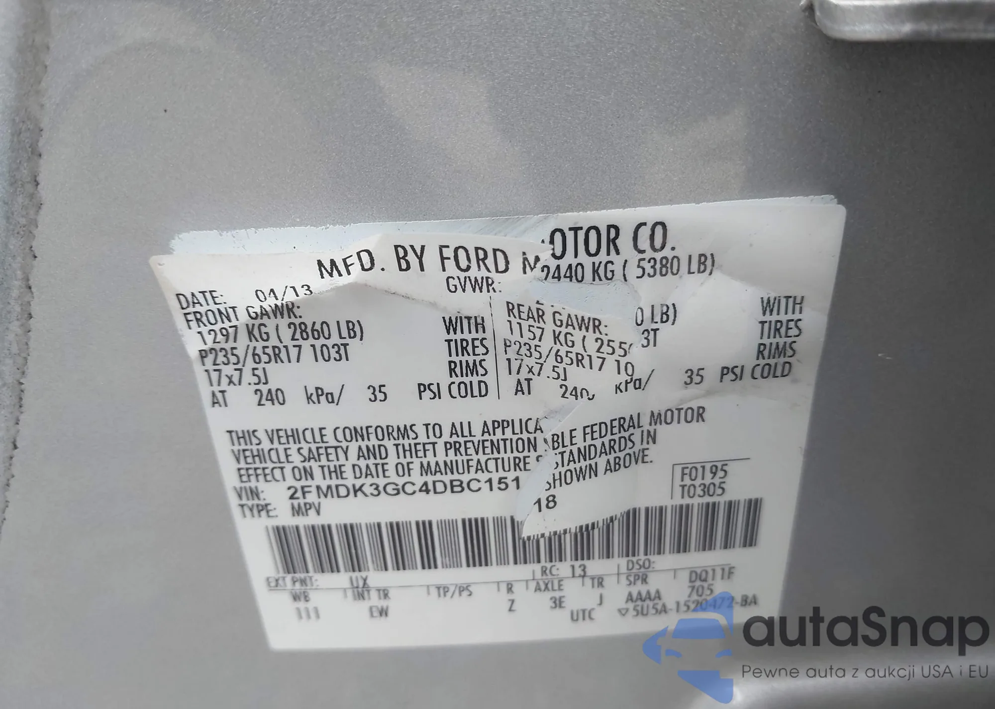LOT: 43567702 VIN: 2FMDK3GC4DBC15118