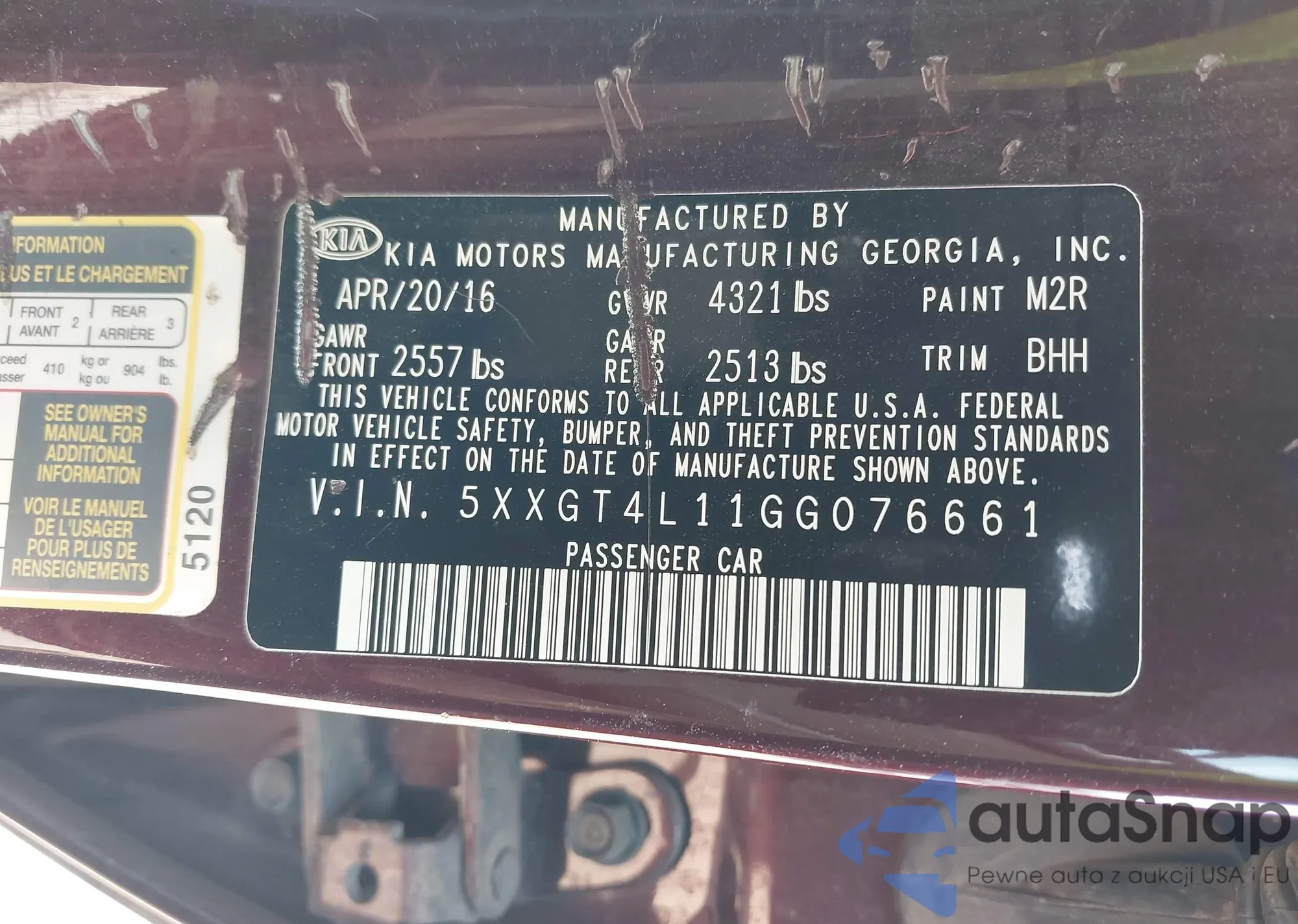 LOT: 42730791 VIN: 5XXGT4L11GG076661