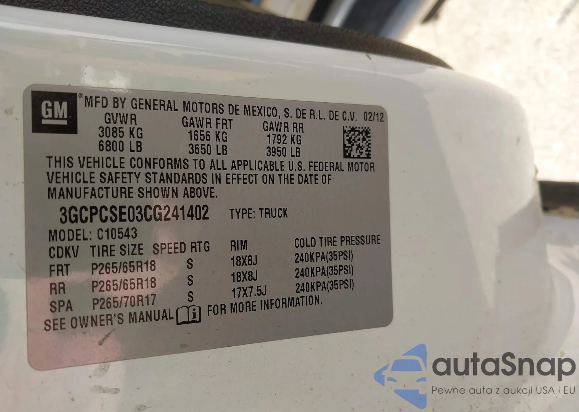 LOT: 43583888 VIN: 3GCPCSE03CG241402