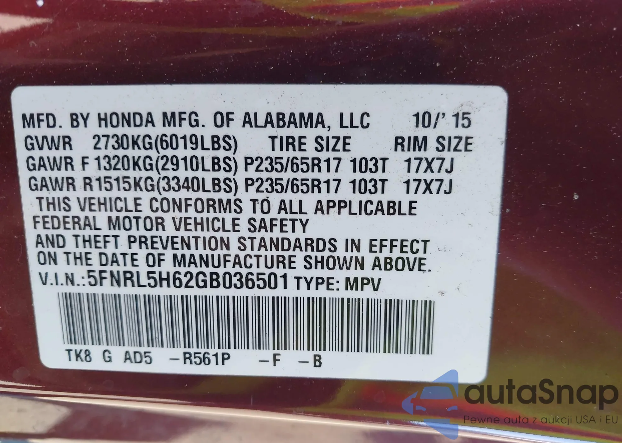 • VIN 5FNRL5H62GB036501