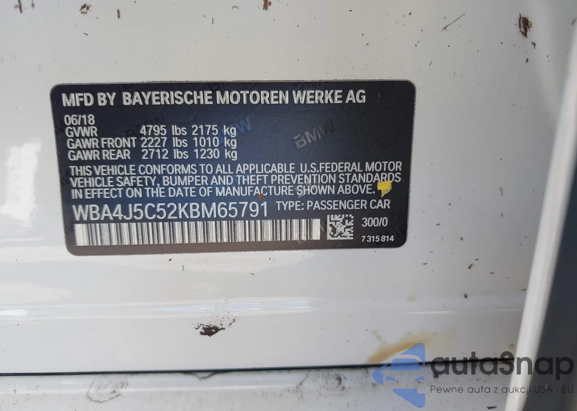 LOT: 43563871 VIN: WBA4J5C52KBM65791