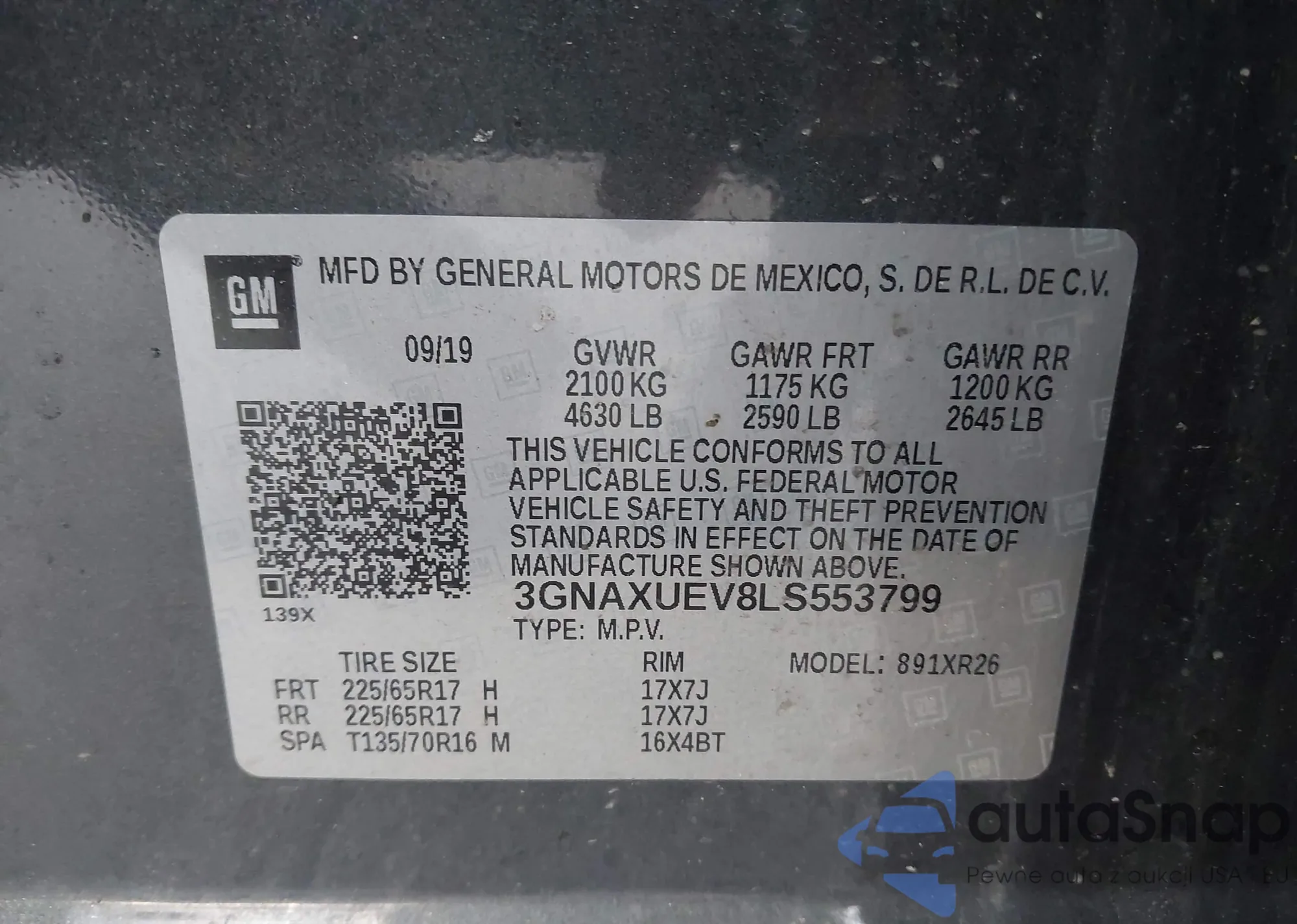 LOT: 43352281 VIN: 2GNAXKEV3L6117395