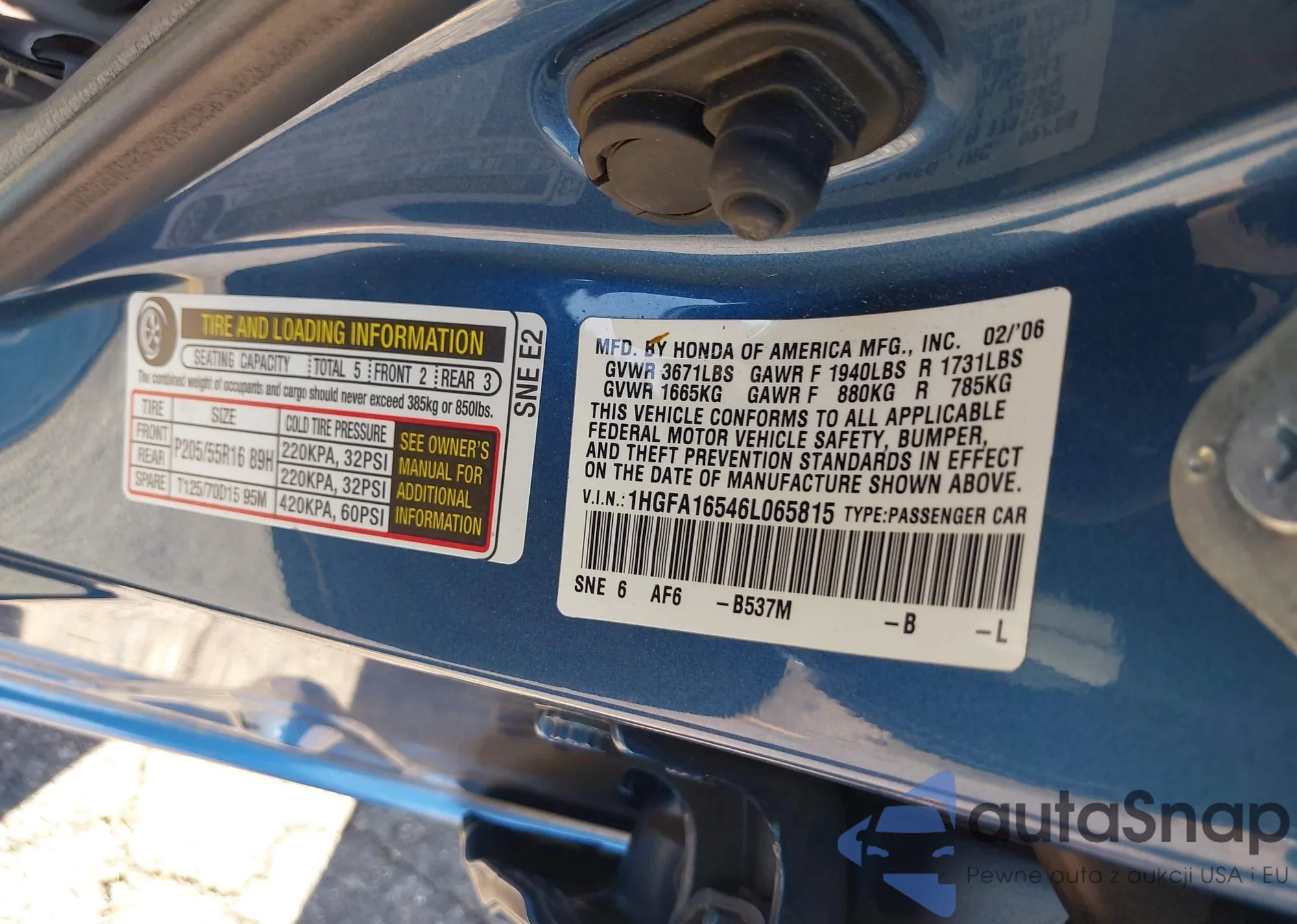 LOT: 43508901 VIN: 1HGFA16546L065815