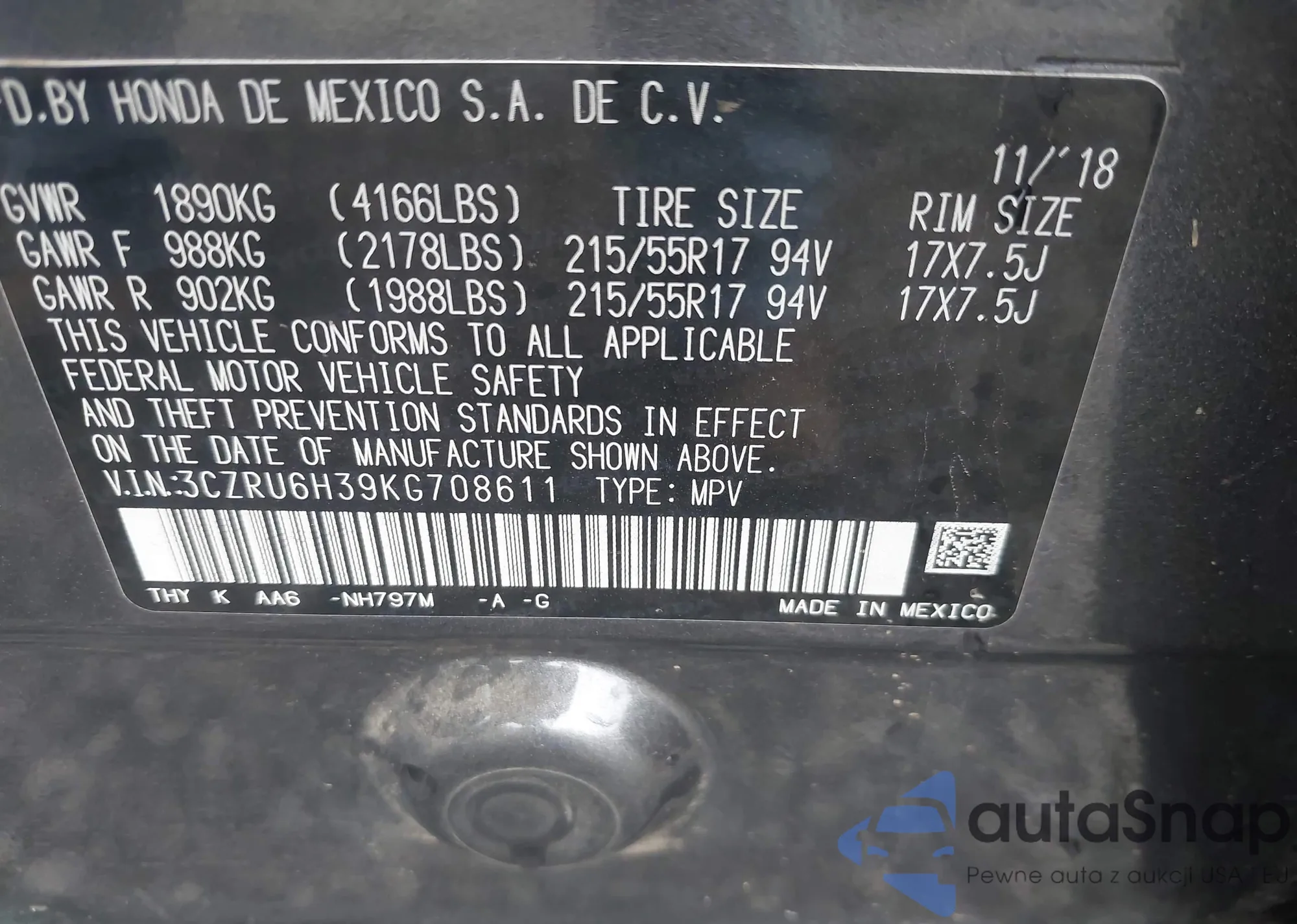 LOT: 43319449 VIN: 3CZRU6H39KG708611