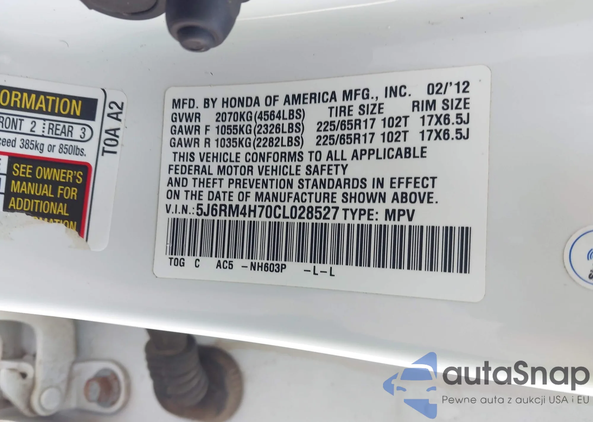 • VIN 5J6RM4H70CL028527