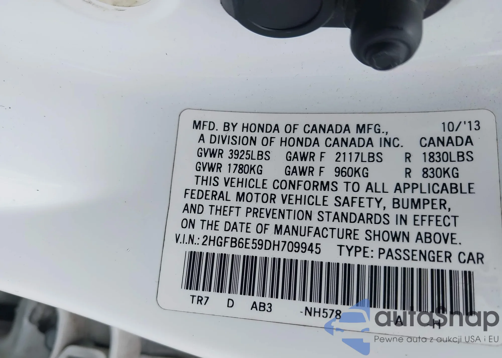 LOT: 42917366 VIN: 2HGFB6E59DH709945