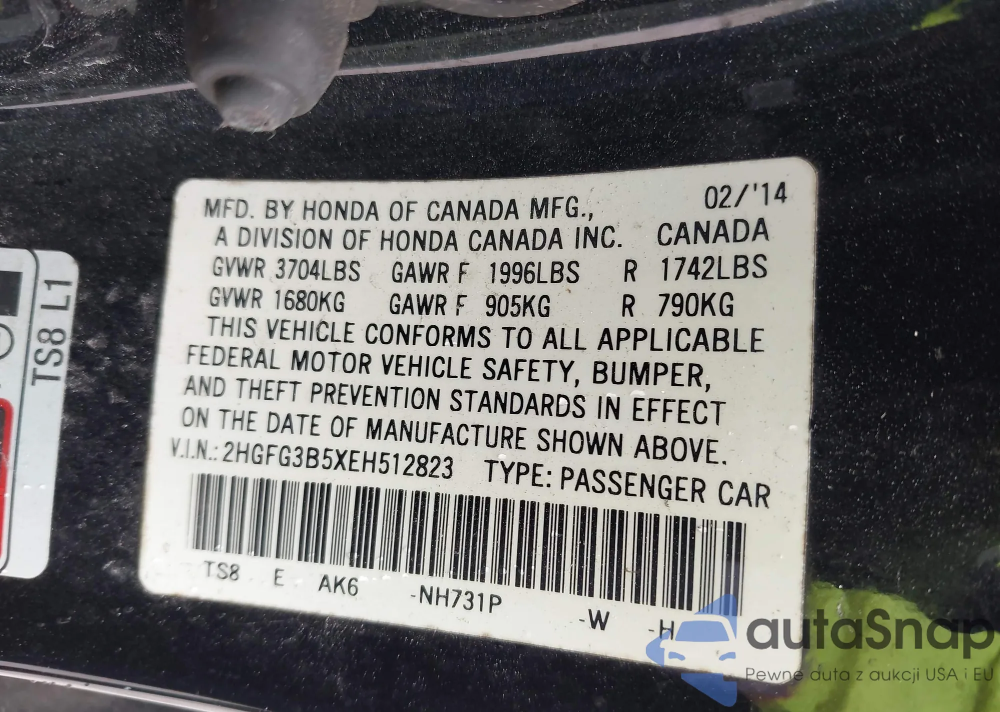 LOT: 43528196 VIN: 2HGFG3B5XEH512823