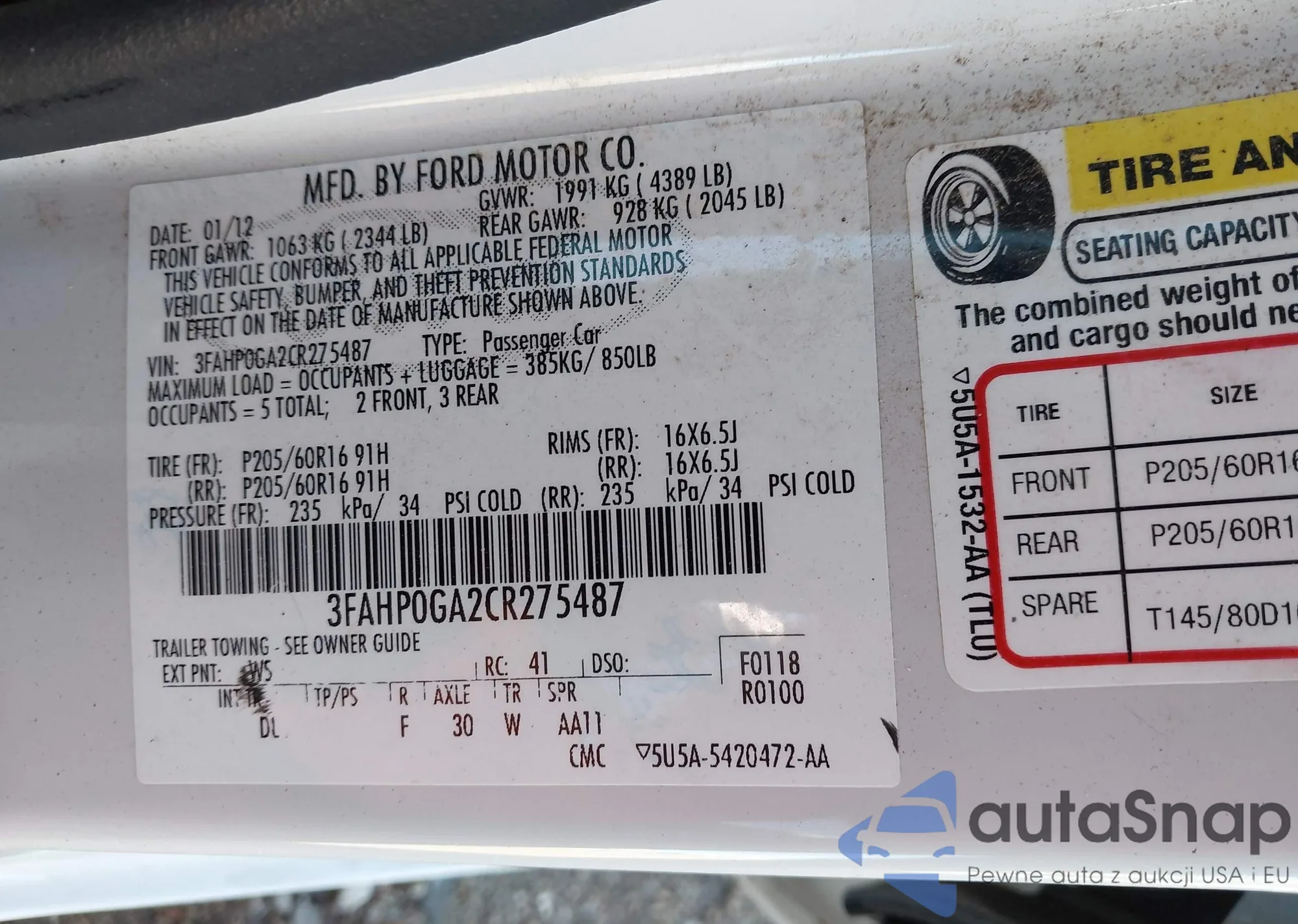 LOT: 43685007 VIN: 3FAHP0GA2CR275487
