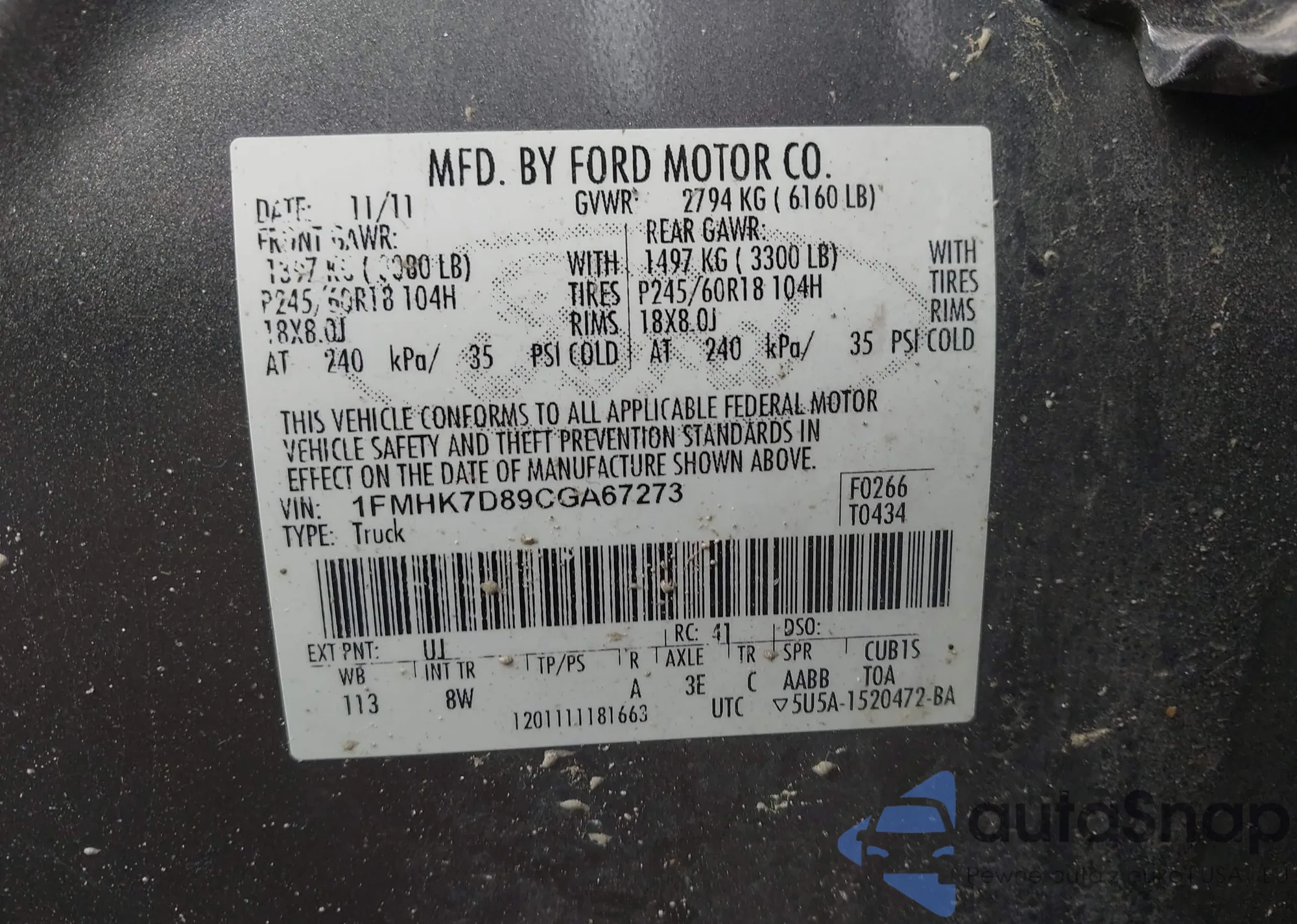 LOT: 43233278 VIN: 1FMHK7D89CGA67273