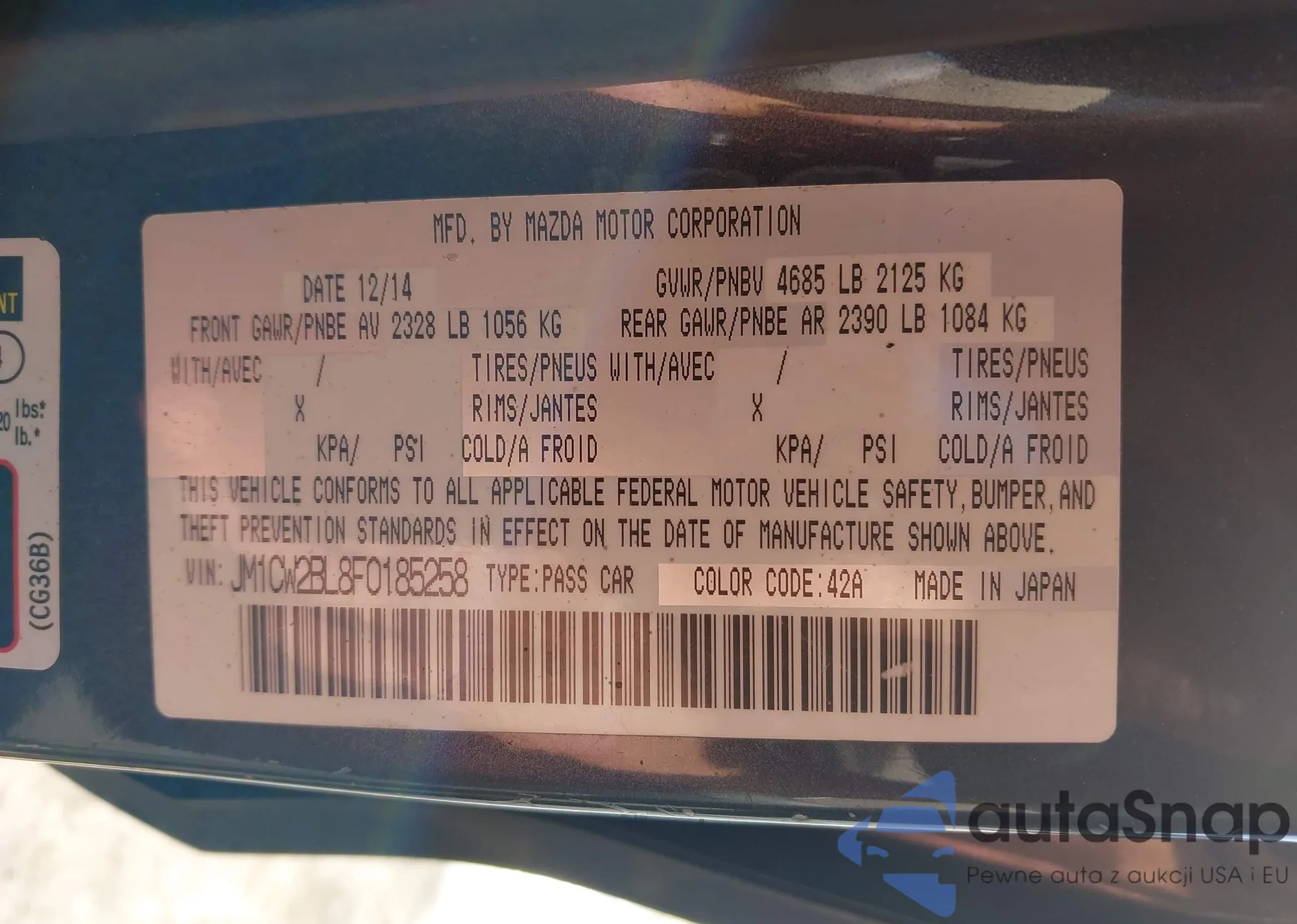 LOT: 43665412 VIN: JM1CW2BL8F0185258