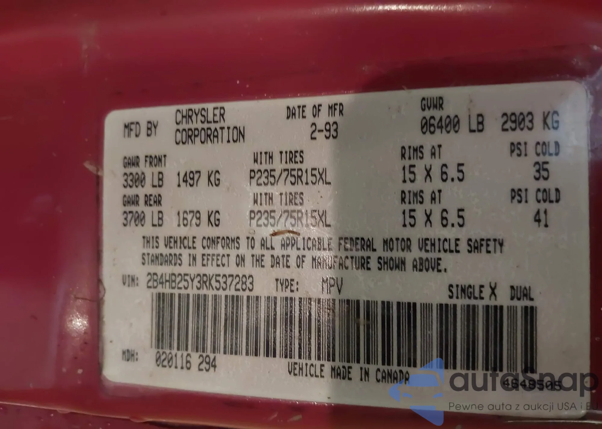 • VIN 2B4HB25Y3RK537283