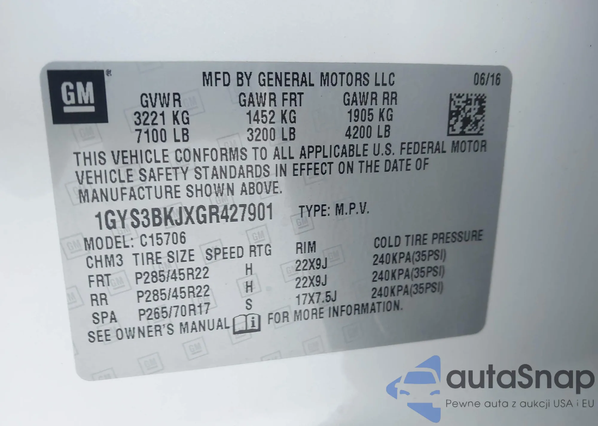 • VIN 1GYS3BKJXGR427901
