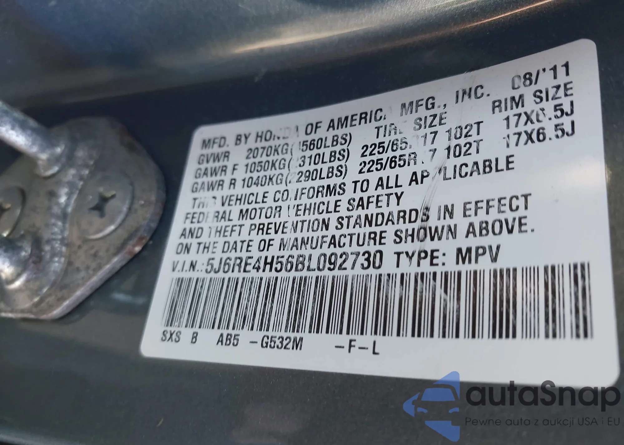 • VIN 5J6RE4H56BL092730