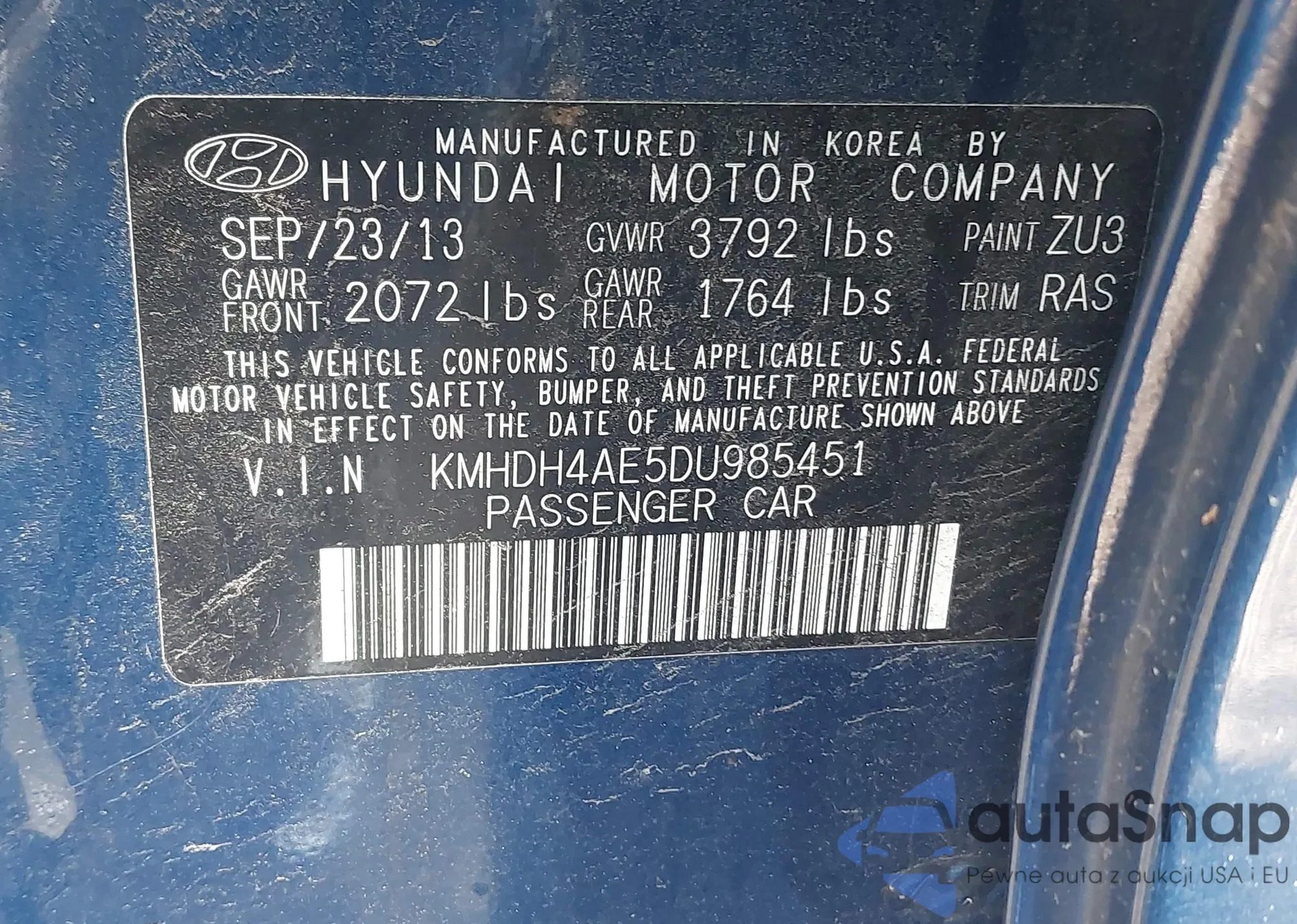 LOT: 43804882 VIN: KMHDH4AE5DU985451