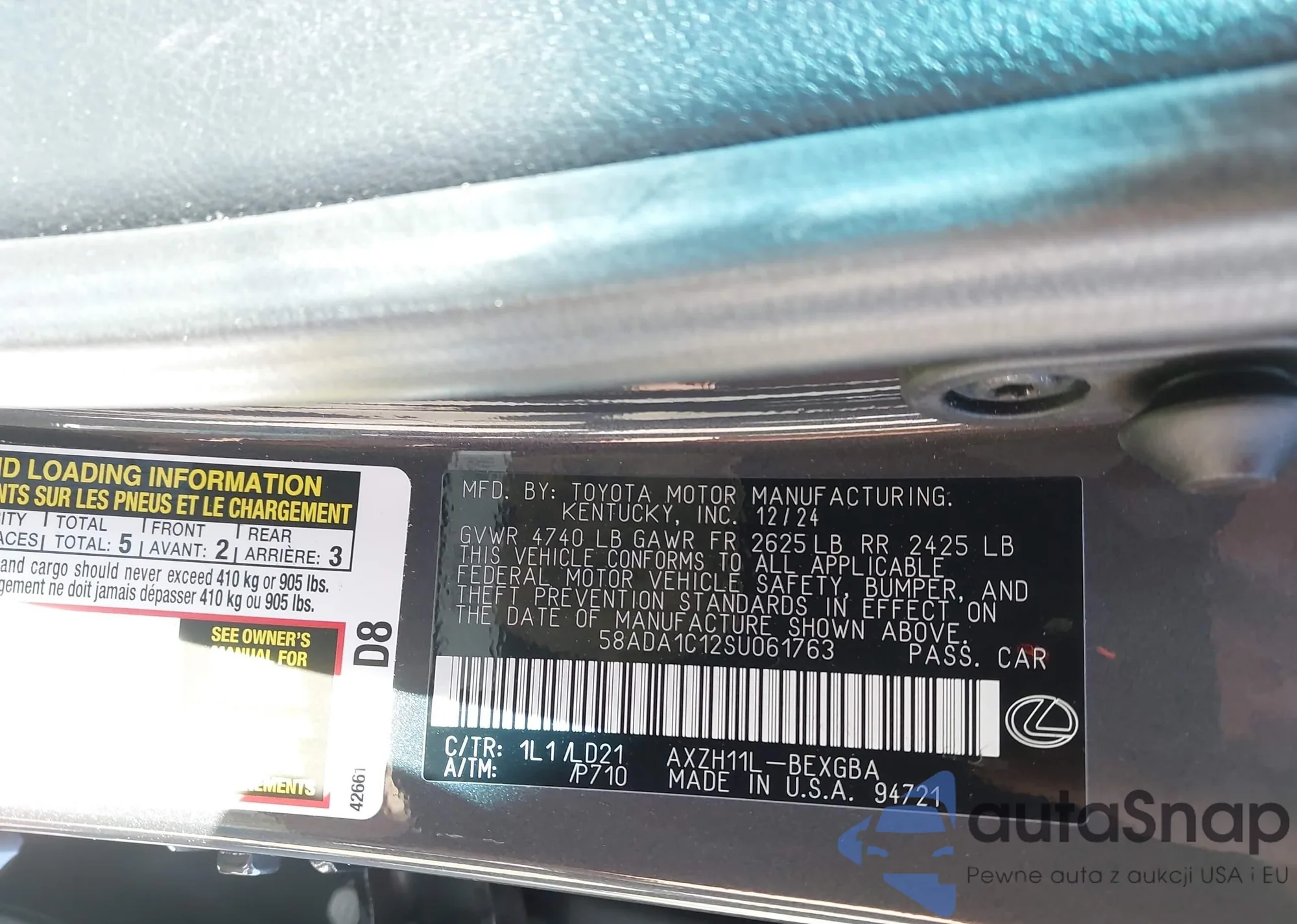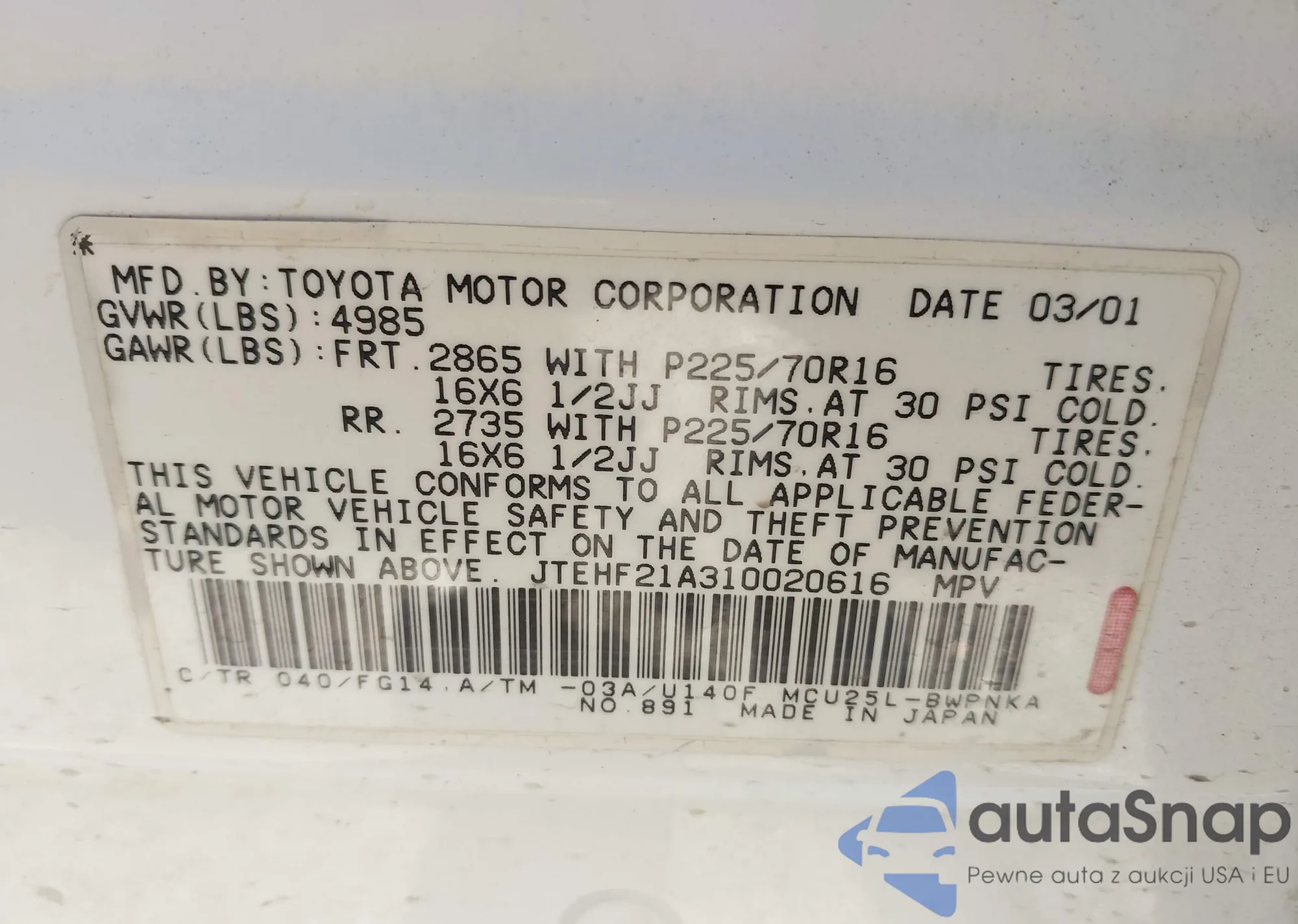LOT: 43390209 VIN: JTEHF21A310020616