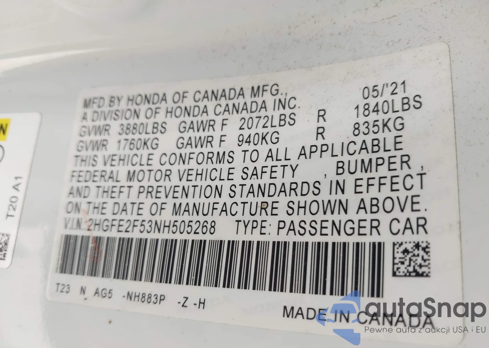 • VIN 2HGFE2F53NH505268